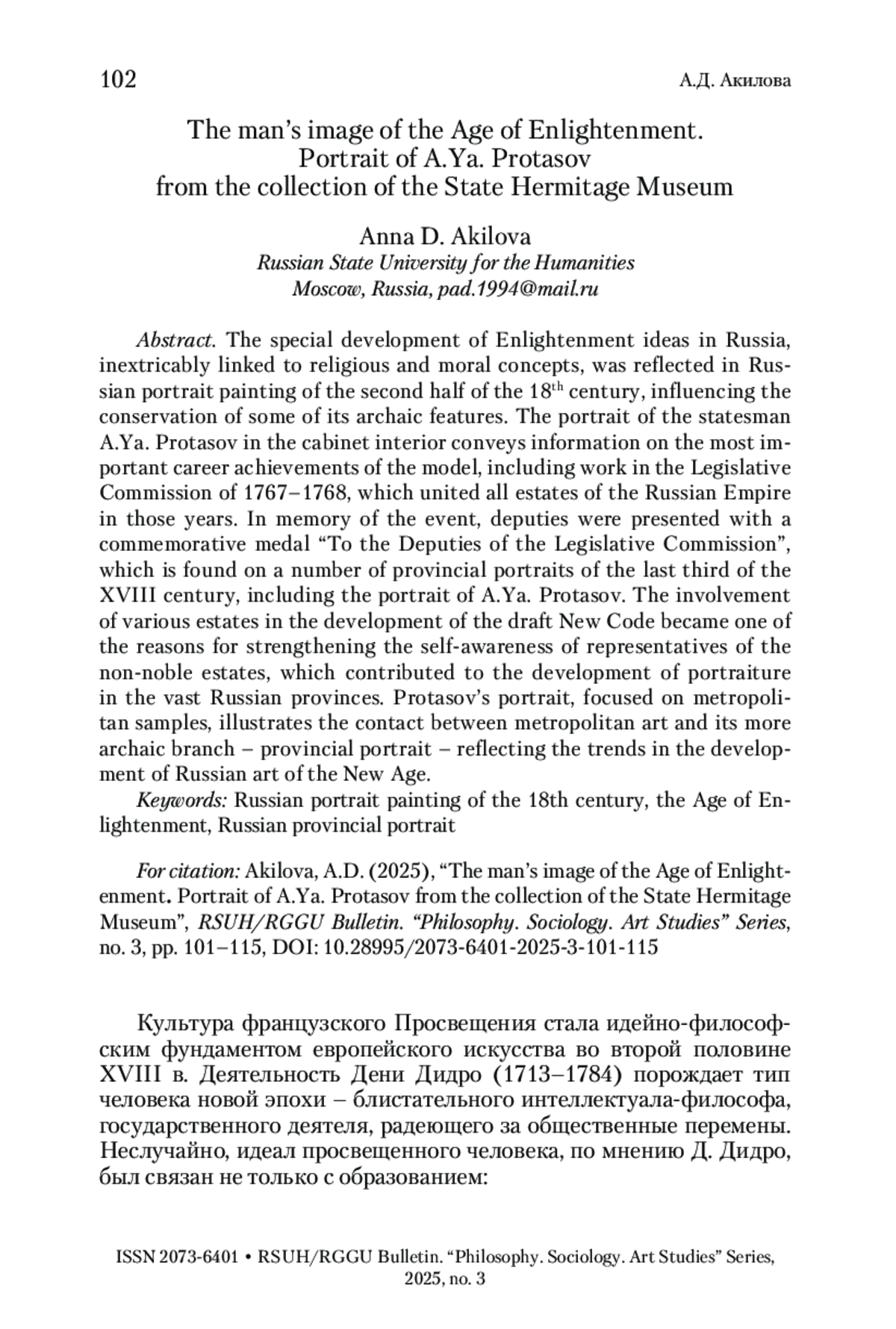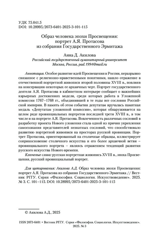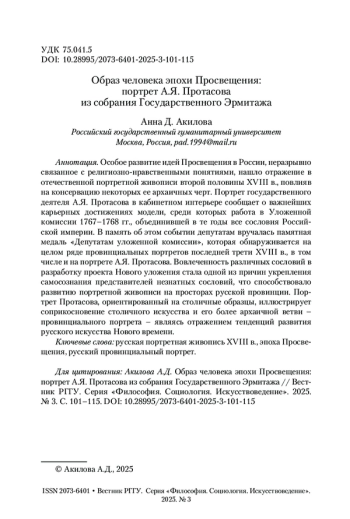 Особое развитие идей Просвещения в России, неразрывно связанное с религиозно-нравственными понятиями, нашло отражение в отечественной портретной живописи второй половины XVIII в., повлияв на консервацию некоторых ее архаичных черт. Портрет государственного деятеля А. Я. Протасова в кабинетном интерьере сообщает о важнейших карьерных достижениях модели, среди которых работа в Уложенной комиссии 1767–1768 гг., объединившей в те годы все сословия Российской империи. В память об этом событии депутатам вручалась памятная медаль «Депутатам уложенной комиссии», которая обнаруживается на целом ряде провинциальных портретов последней трети XVIII в., в том числе и на портрете А. Я. Протасова. Вовлеченность различных сословий в разработку проекта Нового уложения стала одной из причин укрепления самосознания представителей незнатных сословий, что способствовало развитию портретной живописи на просторах русской провинции. Портрет Протасова, ориентированный на столичные образцы, иллюстрирует соприкосновение столичного искусства и его более архаичной ветви – провинциального портрета – являясь отражением тенденций развития русского искусства Нового времени.