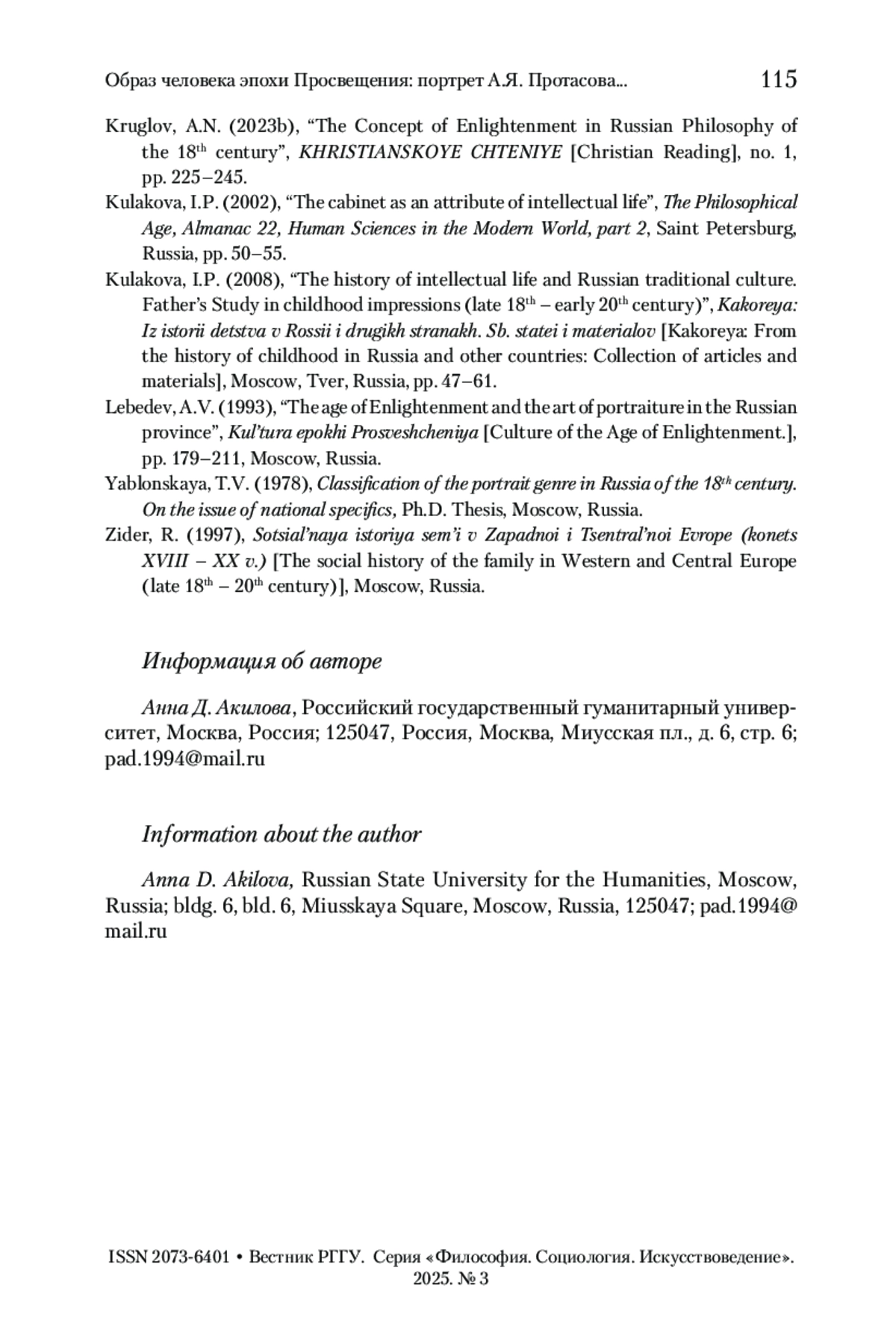 1. Абрамкин 2020 - Абрамкин И.А. Типологические характеристики парадного и камерного изображения в русской портретной живописи XVIII в. // Вестник РГГУ. Серия «Философия. Социология. Искусствоведение». 2020. № 4. С. 112-127. https://doi.org/10.28995/2073-6401-2020-4-112-127.
