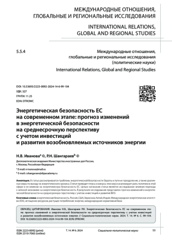 В статье рассматриваются проблемы энергетической безопасности Европы и пути их преодоления, а также различные меры по выходу из энергетического кризиса. Статья приводит плюсы и минусы этих мер и анализирует роль политики в этой сфере и ее влиянии на энергетическую безопасность ЕС. Целью написания статьи является исследование влияния перехода к зеленой экономике на энергетическую безопасность. В результате исследования представлен прогноз изменений в энергетической безопасности на среднесрочную перспективу с учетом инвестиций и развития ВИЭ.
