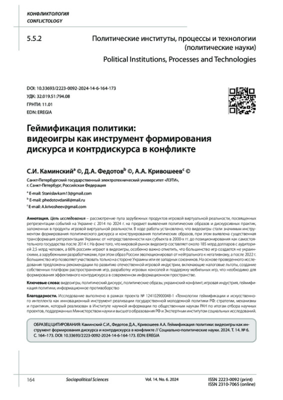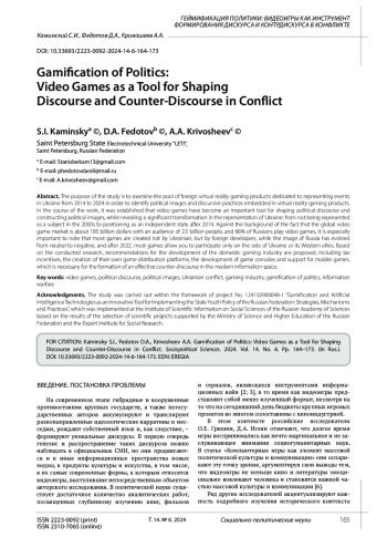 Цель исследования - рассмотрение пула зарубежных продуктов игровой виртуальной реальности, посвященных репрезентации событий на Украине с 2014 по 2024 г. на предмет выявления политических образов и дискурсивных практик, заложенных в продукты игровой виртуальной реальности. В ходе работы установлено, что видеоигры стали значимым инструментом формирования политического дискурса и конструирования политических образов, при этом выявлена существенная трансформация репрезентации Украины: от непредставленности как субъекта в 2000-х гг. до позиционирования как самостоятельного государства после 2014 г. На фоне того, что мировой рынок видеоигр составляет около 185 млрд долларов с аудиторией 2,5 млрд человек, а 66% россиян играют в видеоигры, особенно важно отметить, что большинство игр создается не украинскими, а зарубежными разработчиками, при этом образ России эволюционировал от нейтрального к негативному, а после 2022 г. большинство игр позволяет участвовать только на стороне Украины или ее западных союзников. На основе проведенного исследования предложены рекомендации по развитию отечественной игровой индустрии, включающие налоговые льготы, создание собственных платформ распространения игр, разработку игровых консолей и поддержку мобильных игр, что необходимо для формирования эффективного контрдискурса в современном информационном пространстве.