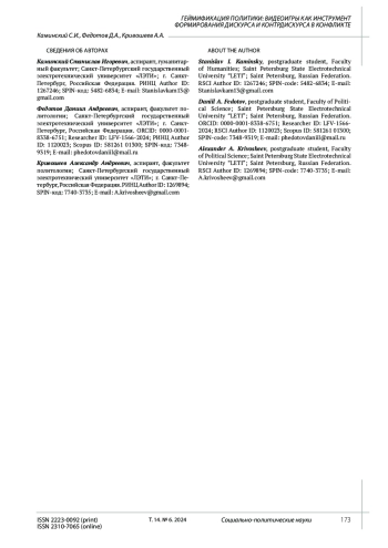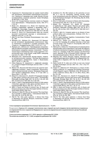 13. Belyaev D.A., Kutomanov S.A., Reznik S.V. Propaganda strategies in video games: practices and current topics. Nomothetika: Philosophy. Sociology. Right. 2021. Vol. 46. No. 3. Pp. 443-450. DOI: 10.52575/2712-746X-2021-46-3-443-450 EDN: SEWALF