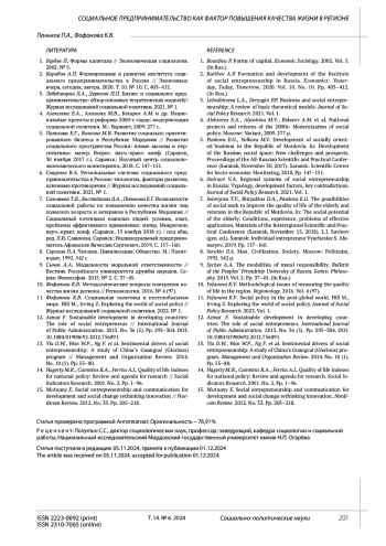 6. Смирнов В.А. Региональные системы социального предпринимательства в России: типология, факторы развития, ключевые противоречия // Журнал исследований социальной политики. 2021. № 1. EDN: PRGWSK