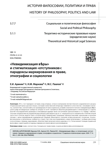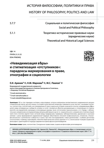 XIX в. стал периодом в истории, когда впервые, согласно материалам лингвистического академического ресурса «Национальный корпус русского языка», в истории отечественной литературы появляются сотни текстов с лексемами «сектанты», «сектантство», «сектантский» и их производными. В таких социальных условиях начинаются попытки «невидимизации вѣры» целого ряда исповедальных сообществ, которые не хотят становиться объектов дискриминации и стигматизации со стороны властей и исследователей, изучающих и описывающих маркеры таких «отступников» («раскольников» и т. п.). Наряду с «обличительным» направлением исследований ряда авторов, работавших в русле т. н. «охранительного» направления в политике второй трети этого столетия, ведется поиск согласия между придворными, правовыми, публицистическими, церковными и научными элитами с целью формирования академической традиции объективного описания конфессиональных, этнических, этноконфессиональных и религиозных сообществ в стране, при этом конструировались новые религионимы с особыми денотатами и коннотатами, к примеру, «единоверие», «благочестивая греческаго закону церковь» и т. п. Статья излагает позицию социальной философии с ориентацией на подходы современного философского религиоведения.