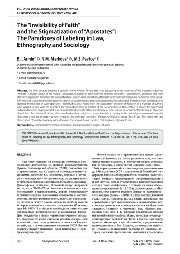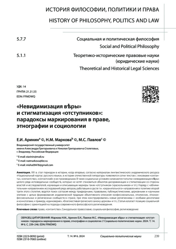 Markova N.M., Arinin E.I., Golenko V.V., Pavlov M.S. Orthodoxy in the perspective of the formation of compliance with legal, journalistic, scientific, historical and artistic social subcultures in the second quarter of the XIX century (according to the National Corpus of the Russian language). Sociopolitical Science. 2024. Vol. 14. No. 3. Pp. 171-180. (In Rus.). DOI: 10.33693/2223-0092-2024-14-3-171-180 EDN: JQURCY