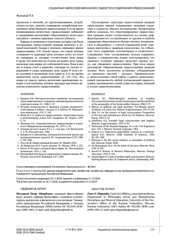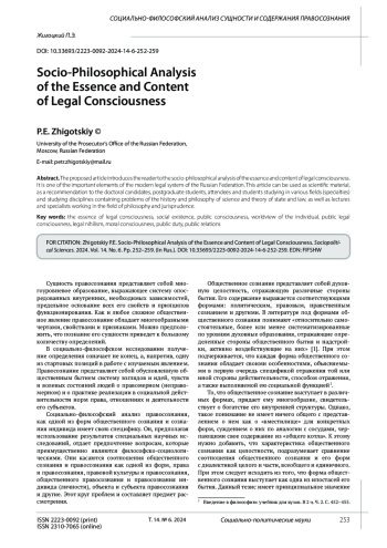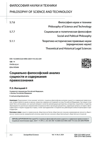 Предлагаемая статья знакомит читателя с социально-философским анализом сущности и содержания правосознания, которое является одним из важных элементов современной правовой системы Российской Федерации. Настоящая статья может быть использована, как научный материал в качестве рекомендации докторантам, аспирантам, слушателям и студентам, обучающимся по различным направлениям (специальностям) и изучающим дисциплины, содержащие вопросы истории и философии науки и теории государства и права, а также преподавателям и специалистам, работающим в области философии и юриспруденции.