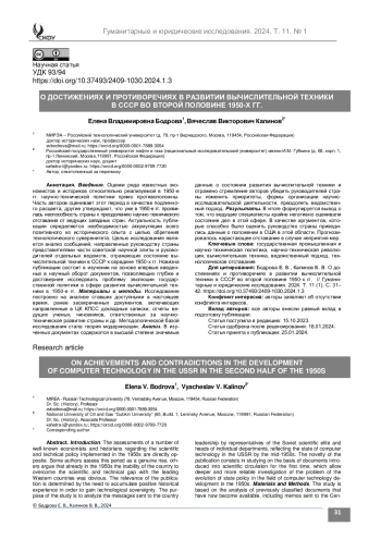 Введение. Оценки ряда известных экономистов и историков относительно реализуемой в 1950-е гг. научно-технической политики прямо противоположны. Часть авторов оценивает этот период в качестве подлинного расцвета, другие утверждают, что уже в 1950-е гг. проявилась неспособность страны к преодолению научно-технического отставания от ведущих западных стран. Актуальность публикации определяется необходимостью аккумуляции всего позитивного из исторического опыта с целью обретения технологического суверенитета. Целью исследования является анализ сообщений, направленных руководству страны представителями части советской научной элиты и руководителей отдельных ведомств, отражающих состояние вычислительной техники в СССР к середине 1950-х гг. Новизна публикации состоит в изучении на основе впервые введенных в научный оборот документов, позволяющих глубже и достовернее исследовать проблему эволюции государственной политики в сфере развития вычислительной техники в 1950-е гг.