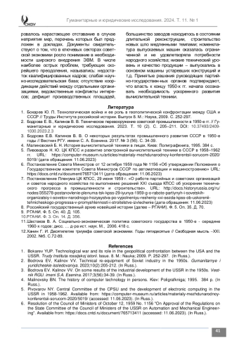 2. Бодрова Е. В., Калинов В. В. Техническое перевооружение советской промышленности в 1950-е гг. // Гуманитарные и юридические исследования. 2023. Т. 10 (2). С. 205-211. https://doi.org/10.37493/2409-1030.2023.2.3