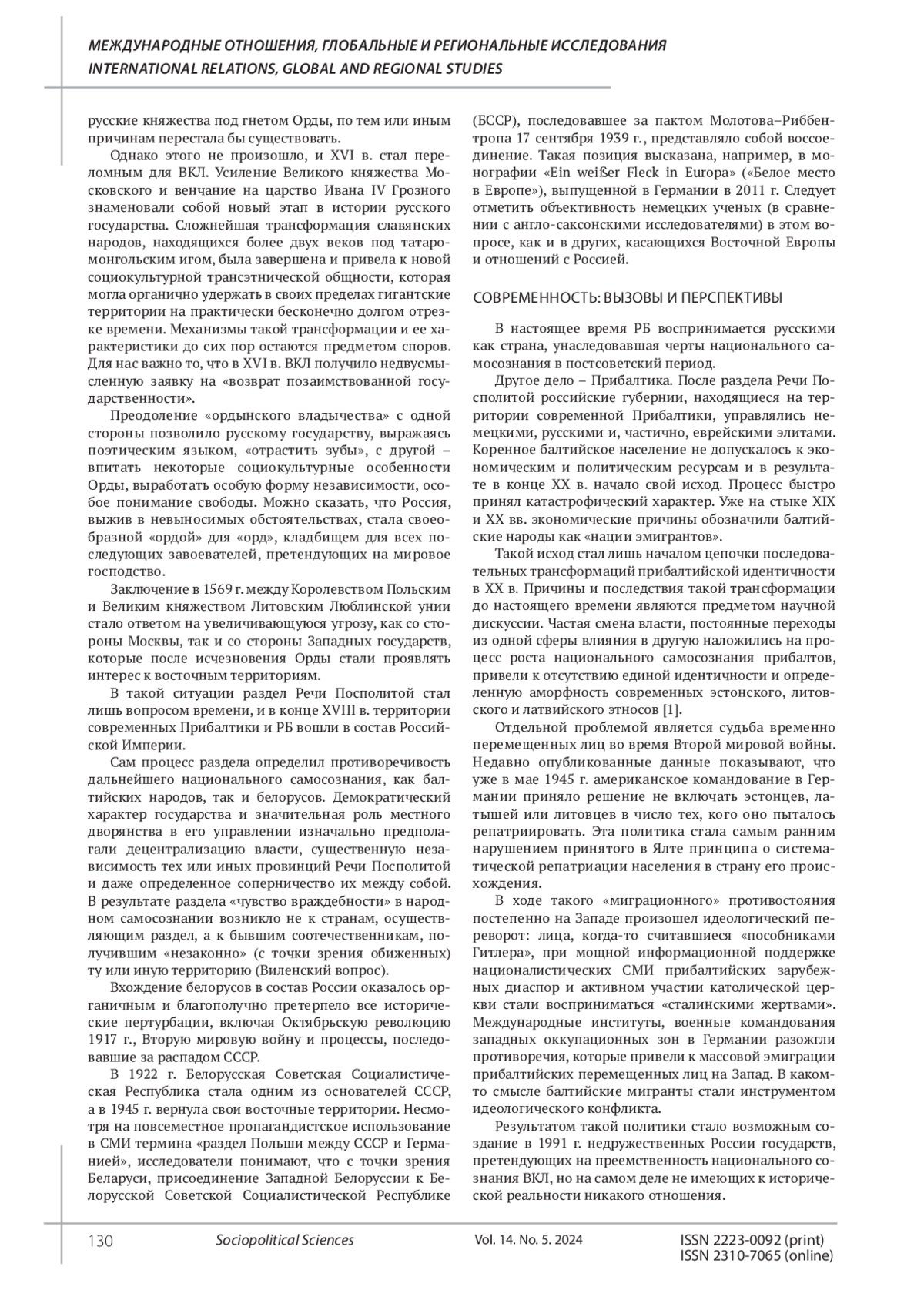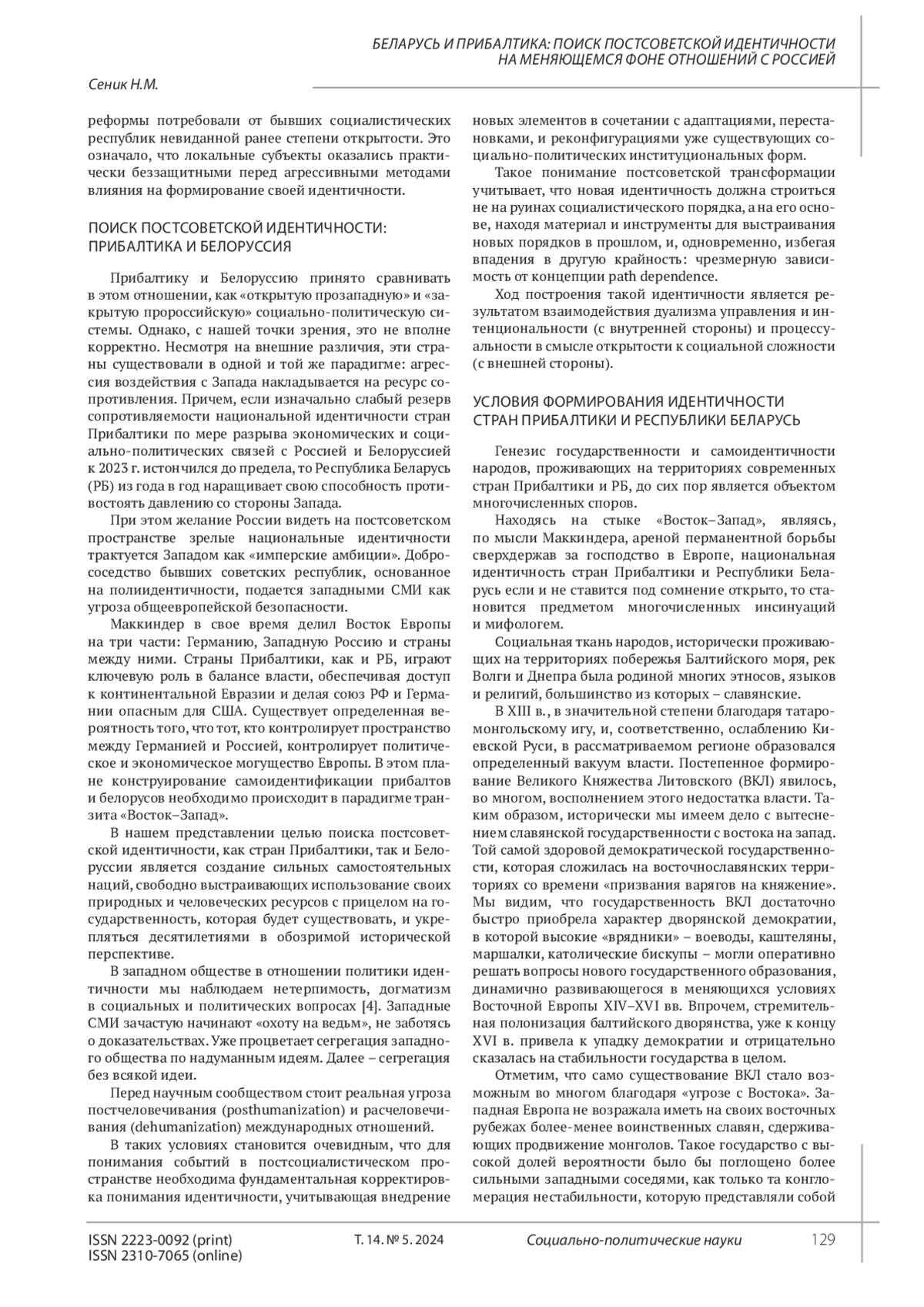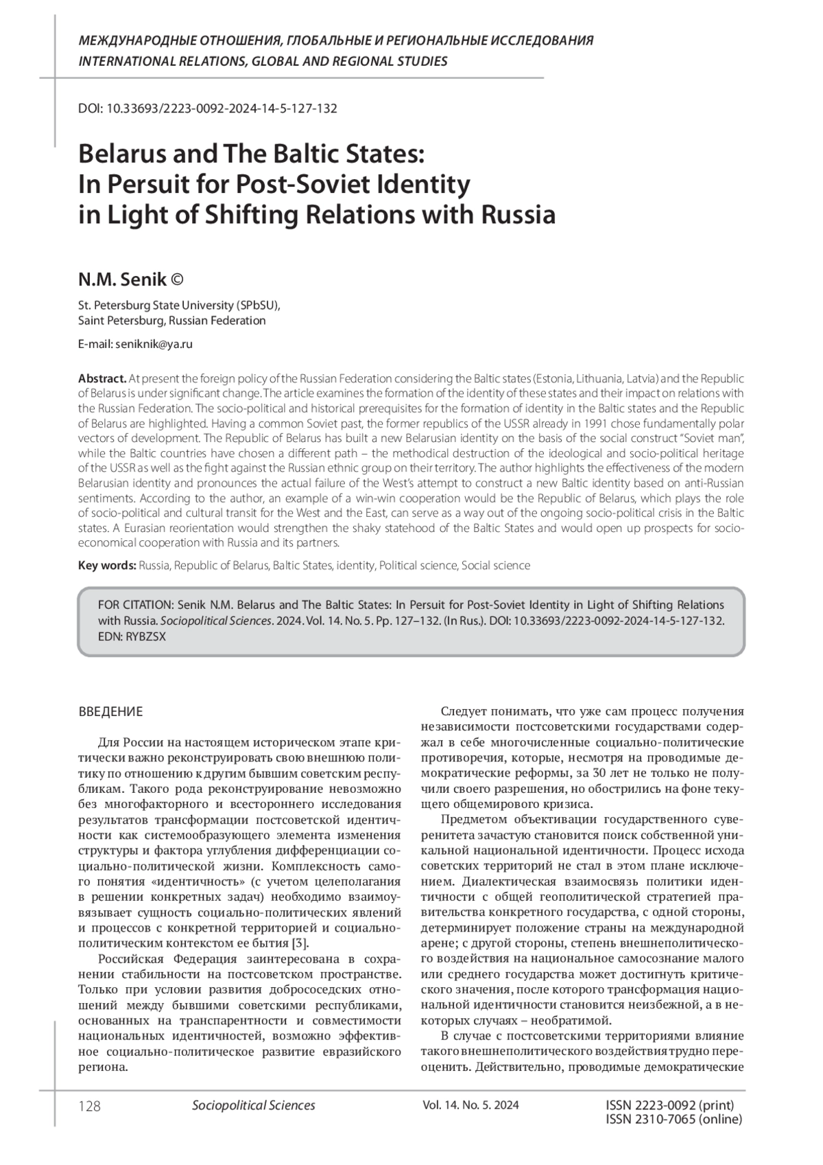 На современном этапе внешняя политика Российской Федерации в отношении стран Прибалтики (Эстония, Литва, Латвия) и Республики Беларусь претерпевает значительные изменения. В статье рассматриваются процессы формирования идентичности указанных государств и их влияние на взаимоотношения с РФ. Выделены социально-политические и исторические предпосылки формирования идентичности в странах Прибалтики и Республики Беларусь. Обладая общим советским прошлым, бывшие республики СССР уже в 1991 г. выбирали принципиально полярные векторы развития. Республика Беларусь на основе социального конструкта “советский человек” выстроила новую белорусскую идентичность, тогда как страны Прибалтики выбрали иной путь - методичное уничтожение идеологического и социально-политического наследия СССР, а также борьбу с русским этносом на своей территории. Автор отмечает эффективность современной белорусской идентичности и констатирует фактическую неудачу попытки сконструировать Западом новую идентичность Прибалтики в основе которой лежат антироссийские настроения. Выходом из текущего социально-политического кризиса отношений с Прибалтийскими государствами, по мнению автора, может послужить пример формирования добрососедских отношений с Республикой Беларусь, выполняющей роль социально-политического и культурного транзита между Западом и Востоком. Евразийская переориентация позволила бы укрепить шаткую государственность Прибалтики и открыла бы перспективы для социально-экономического сотрудничества с Россией и ее партнерами.