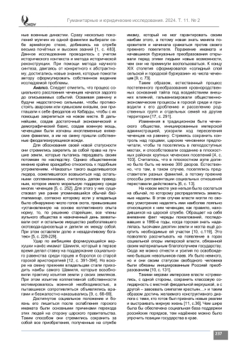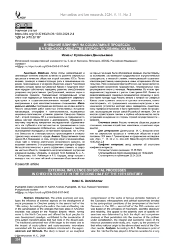 Введение. Автор статьи рассматривает и анализирует влияние внешних аспектов на развитие социальных процессов в чеченских обществах второй половины XIX в. По его мнению, основную и главенствующую роль в гальванизации перемен, происходивших в чеченских обществах, играла Российская империя, которая, придя на Северный Кавказ и предложив местным народам собственную парадигму развития, способствовала ускорению внутрисистемных преобразований, имевших корни в отдаленном прошлом. Традиционный патриархальный уклад жизни стал подвергаться испытаю из-за воздействия социальнокультурных и социально-экономических новаций, связанных с внедряемыми в крае капиталистическими отношениями.