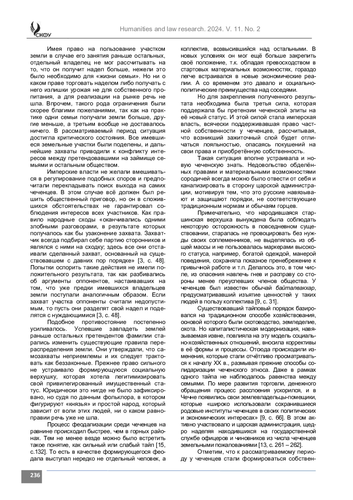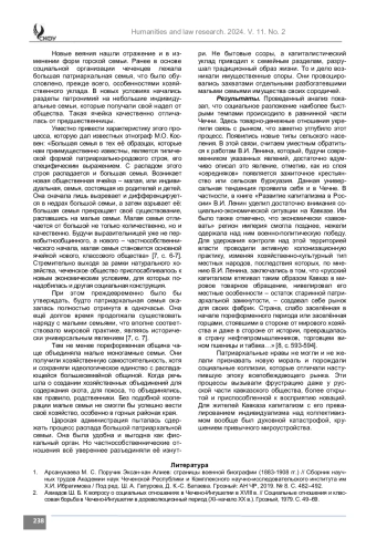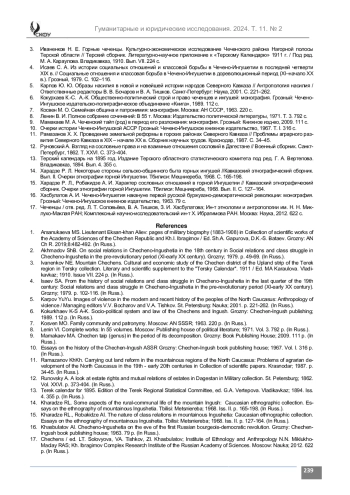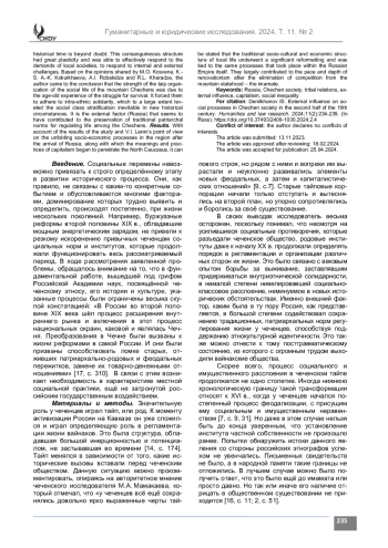 Материалы и методы. Исследование построено на основе аналитического осмысления работ известных отечественных историковкавказоведов, этнографов и политэкономистов, посвященных социально-политическим условиям развития Северного Кавказа XVII – второй половины XIX в. и основывалось на принципах историзма, научной объективности и достоверности. Обращение к научному творчеству конкретных исследователей обусловливалось как глубиной и всесторонностью их проникновения в существо рассматриваемой проблематики, интегральным и панорамным видением исследуемых исторических процессов, так и, отчасти, близостью их этнонационального происхождения к этнокультурному миру чеченского народа.