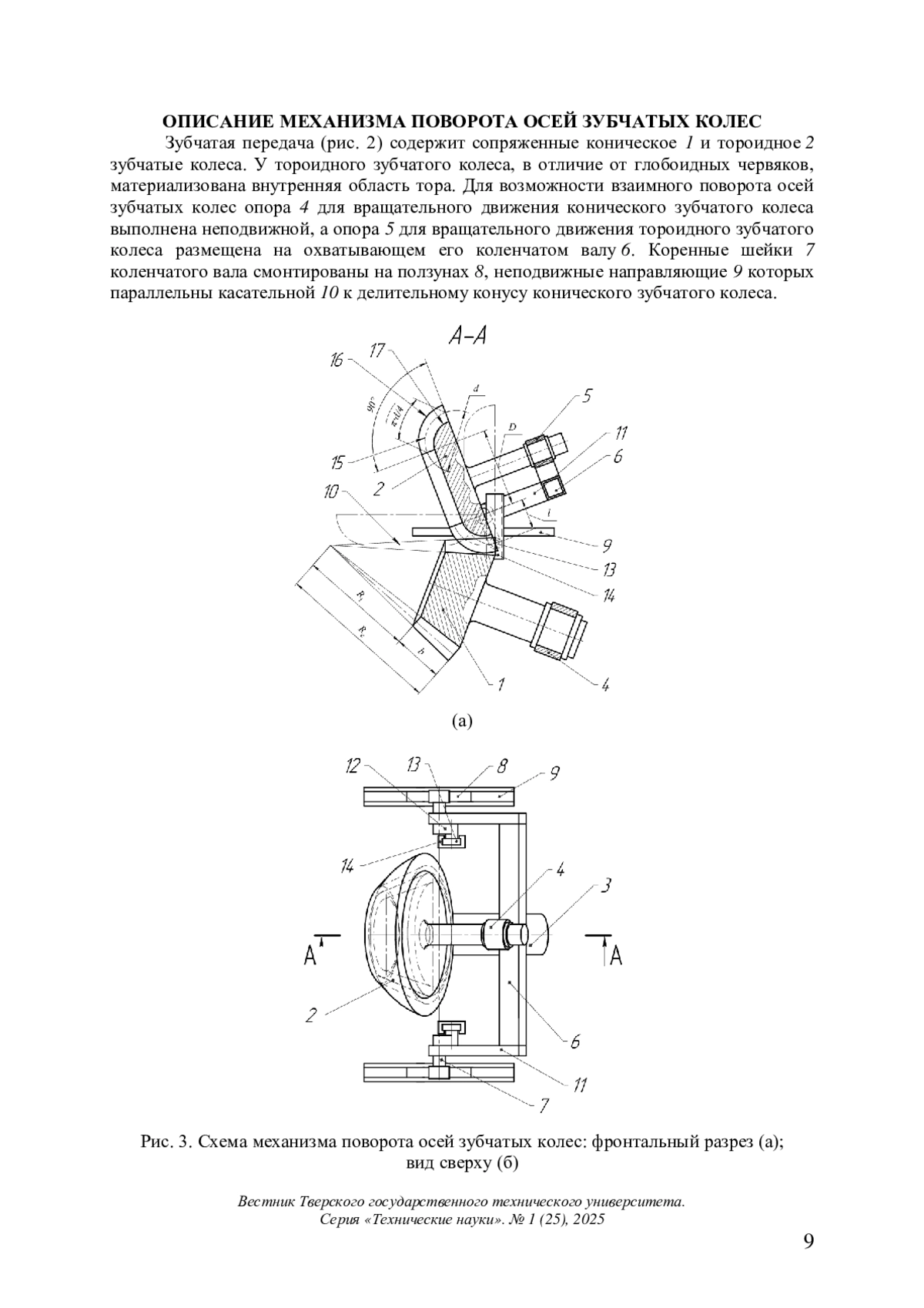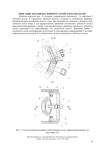Статья посвящена синтезу зубчатой передачи с возможностью изменения угла между осями колес. Приведено решение для передачи, одно из зубчатых колес которой коническое, а второе – тороидное с материализованной внутренней областью тора. Для этого опора для вращательного движения тороидного зубчатого колеса должна быть размещена на охватывающем его коленчатом валу, коренные шейки которого смонтированы на ползунах с неподвижными направляющими, параллельными касательной к делительному конусу конического зубчатого колеса. Коленчатый вал снабжен синусным механизмом, содержащим смонтированный на щеке коленчатого вала кривошип, соединенный с ползуном, неподвижная направляющая которого расположена перпендикулярно неподвижным направляющим опор коренных шеек коленчатого вала