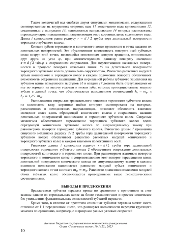 Одной из сторон научно-технического прогресса является ускоренное развитие робототехники, в том числе совершенствование и расширение возможностей приводов. В частности, проводятся научные изыскания в области приводов с изменяющимися углами между осями вращающихся валов. Высшие пары, к которым относятся зубчатые передачи, могут иметь линейное или точечное касание поверхностей звеньев. Линейное касание позволяет обеспечить более высокие прочностные свойства, точечное же дает большую степень свободы. Линейное касание реализовано в зубчатых передачах, делительные поверхности которых представляют собой линейчатые поверхности вращения: в виде прямых круговых цилиндра и конуса, в том числе их предельных вариантов – реечного зацепления и вращения с участием плоского диска, а также однополостного гиперболоида вращения [1]. Точечное касание возможно с участием в качестве делительной поверхности вращения, образованной вращением кривых линий. Представляет интерес рассмотрение поверхностей второго порядка, к которым относятся тор [2] и его частные случаи: сфера [3], эллипсоид, параболоид и двуполостной гиперболоид; они могут соприкасаться в одной точке, вокруг которой возможен взаимный поворот осей таких колес. Рассматривается устройство и обосновываются параметры зубчатой передачи, одно из колес которой коническое, а второе – тороидное и сопряжение колес сохраняется в процессе взаимного поворота их осей