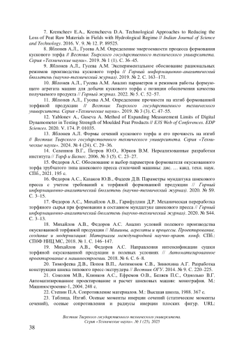 8. Яблонев А.Л., Гусева А.М. Определение энергоемкости процесса формования кускового торфа // Вестник Тверского государственного технического университета. Серия “Технические науки”. 2019. № 1 (1). С. 36-45. EDN: XVISKJ