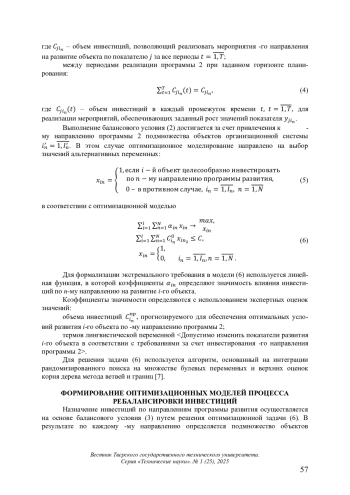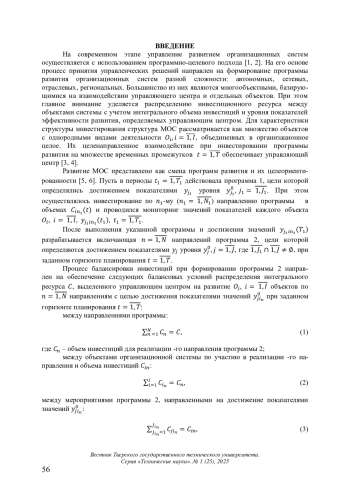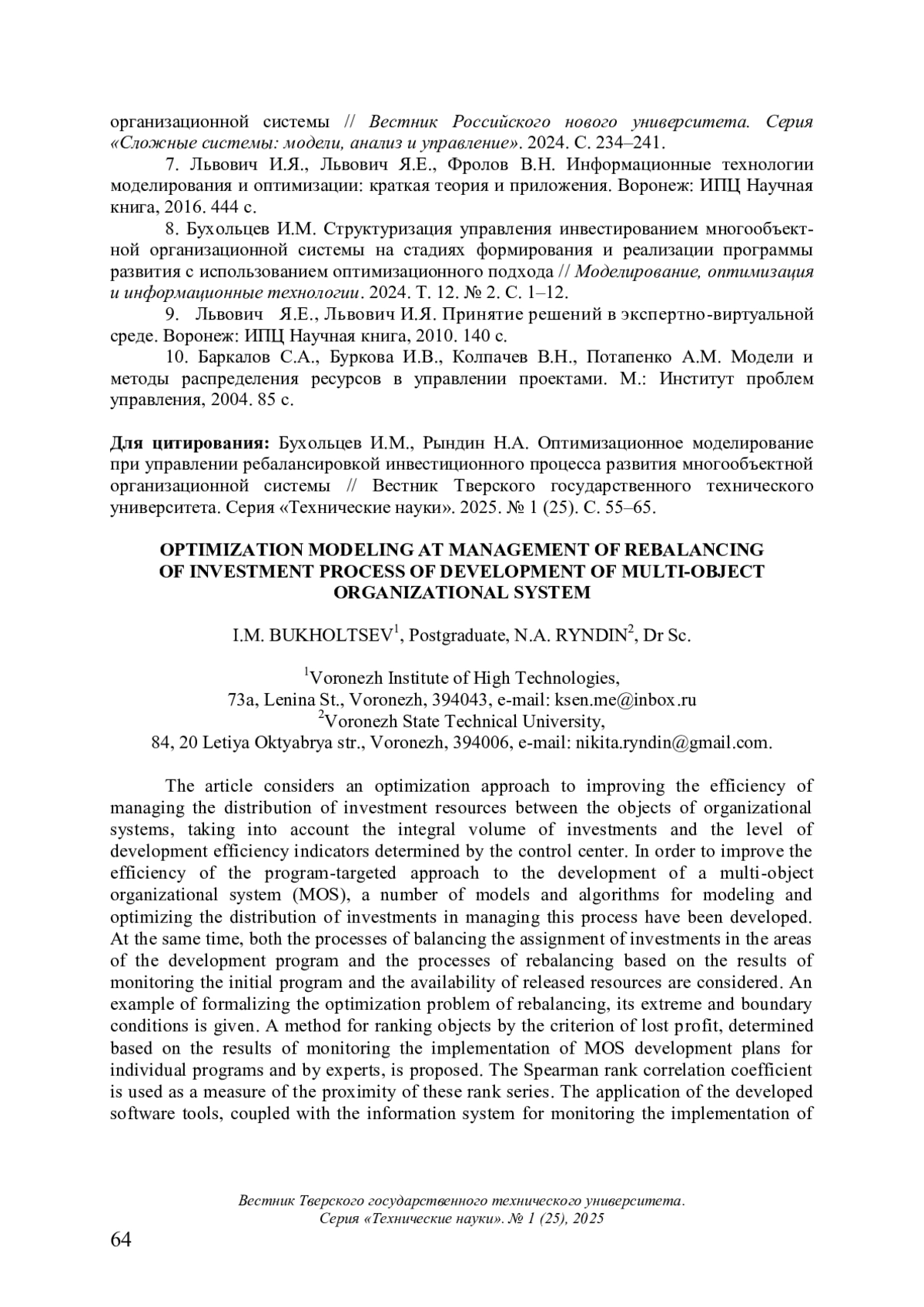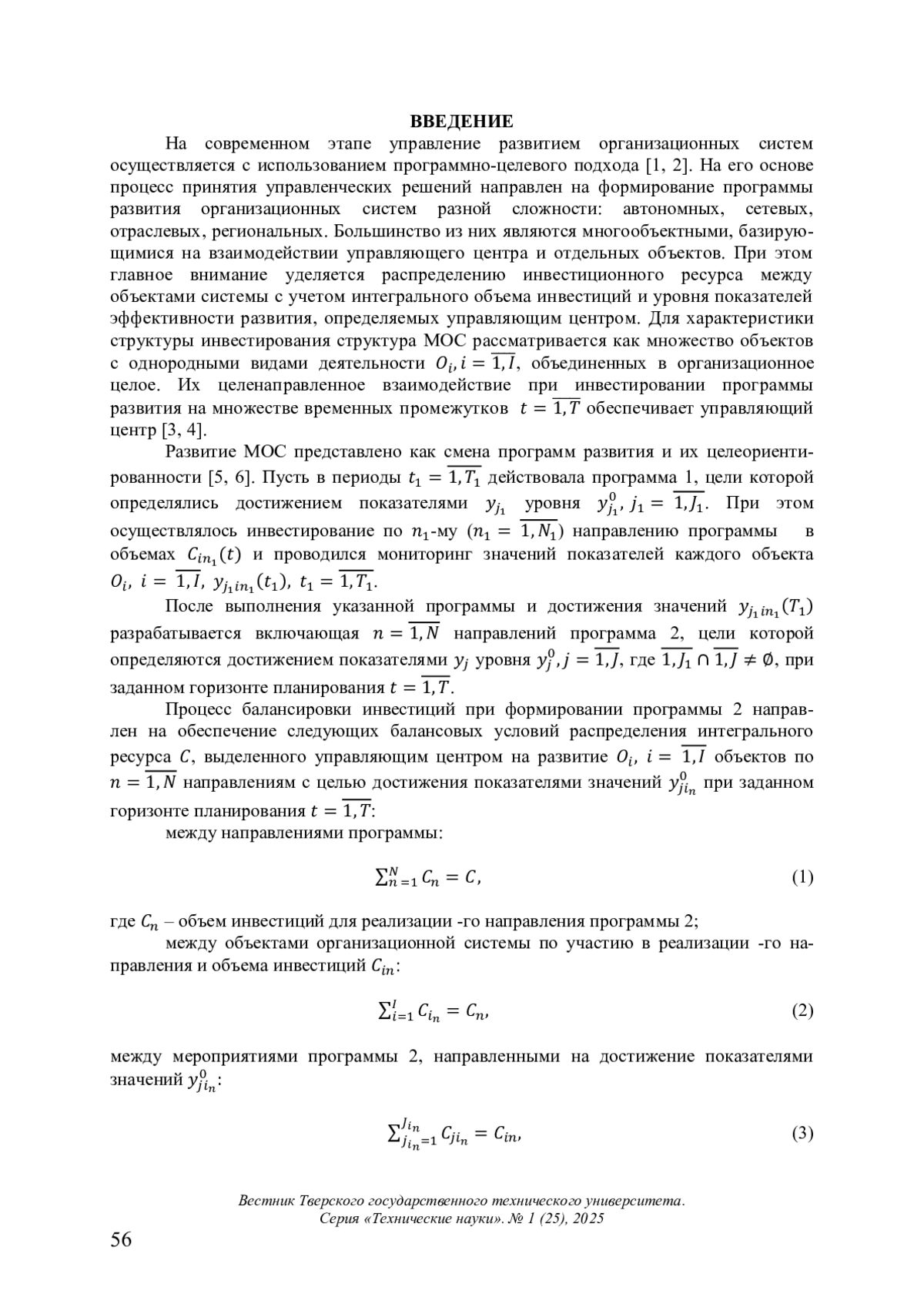 БУХОЛЬЦЕВ И. М., РЫНДИН Н. А. ОПТИМИЗАЦИОННОЕ МОДЕЛИРОВАНИЕ ПРИ УПРАВЛЕНИИ РЕБАЛАНСИРОВКОЙ ИНВЕСТИЦИОННОГО ПРОЦЕССА РАЗВИТИЯ МНОГООБЪЕКТНОЙ ОРГАНИЗАЦИОННОЙ СИСТЕМЫ // ВЕСТНИК ТВЕРСКОГО ГОСУДАРСТВЕННОГО ТЕХНИЧЕСКОГО УНИВЕРСИТЕТА. СЕРИЯ: ТЕХНИЧЕСКИЕ НАУКИ. 2025. № 1 (25)