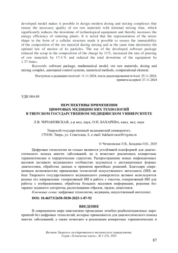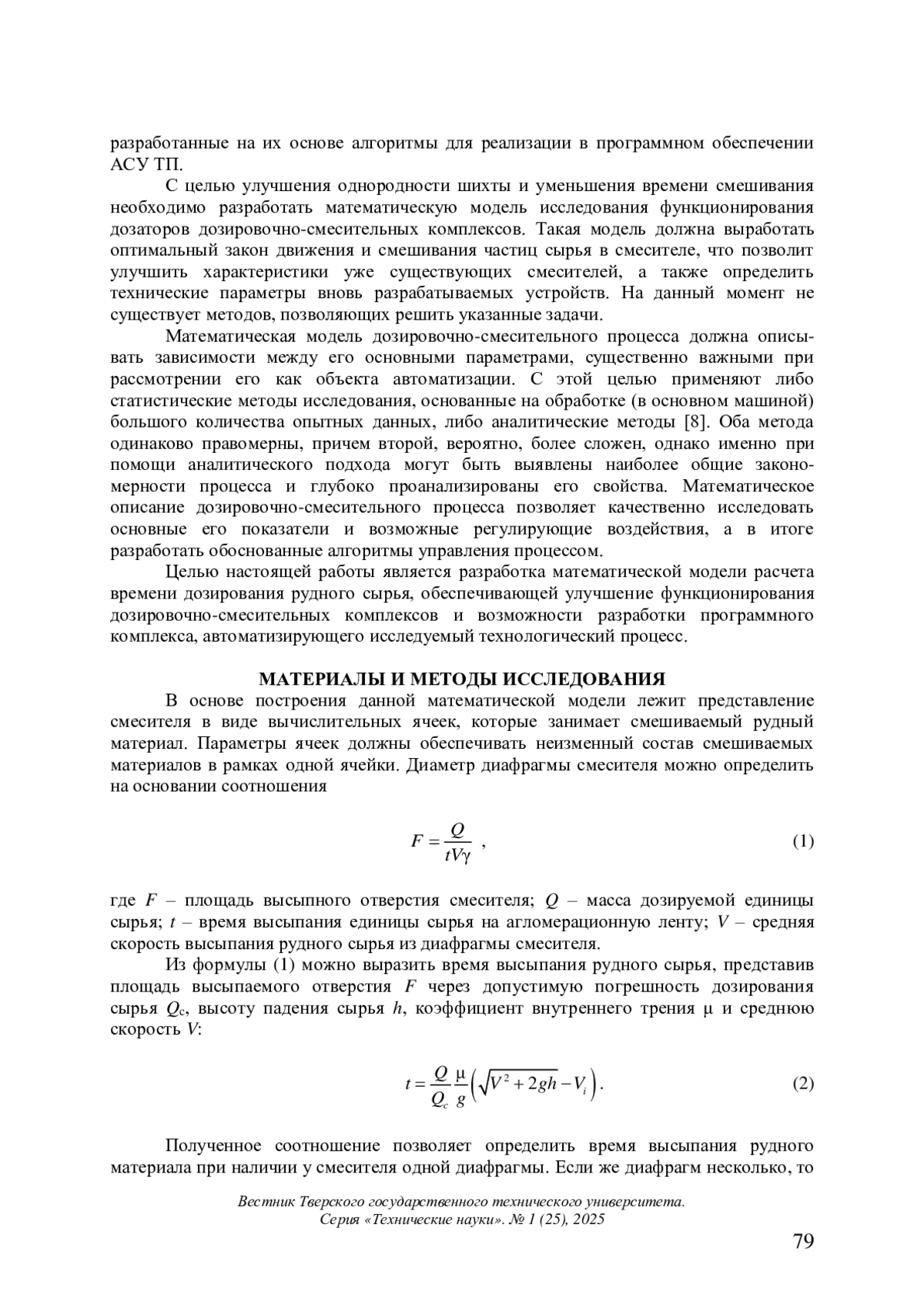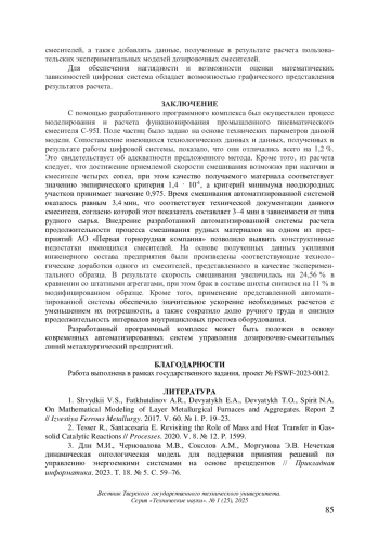 Статья: ПРОГРАММНАЯ РЕАЛИЗАЦИЯ МАТЕМАТИЧЕСКОЙ МОДЕЛИ РАСЧЕТА ВРЕМЕНИ ДОЗИРОВАНИЯ РУДНОГО СЫРЬЯ В ДОЗИРОВОЧНО-СМЕСИТЕЛЬНОМ КОМПЛЕКСЕ АГЛОМЕРАЦИОННОЙ ФАБРИКИ (2025)