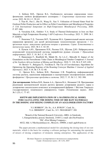БОБКОВ В. И., БЫКОВ А. А., ОРЕХОВ В. А., НЕЗАМАЕВ С. В. ПРОГРАММНАЯ РЕАЛИЗАЦИЯ МАТЕМАТИЧЕСКОЙ МОДЕЛИ РАСЧЕТА ВРЕМЕНИ ДОЗИРОВАНИЯ РУДНОГО СЫРЬЯ В ДОЗИРОВОЧНО-СМЕСИТЕЛЬНОМ КОМПЛЕКСЕ АГЛОМЕРАЦИОННОЙ ФАБРИКИ // ВЕСТНИК ТВЕРСКОГО ГОСУДАРСТВЕННОГО ТЕХНИЧЕСКОГО УНИВЕРСИТЕТА. СЕРИЯ: ТЕХНИЧЕСКИЕ НАУКИ. 2025. № 1 (25)