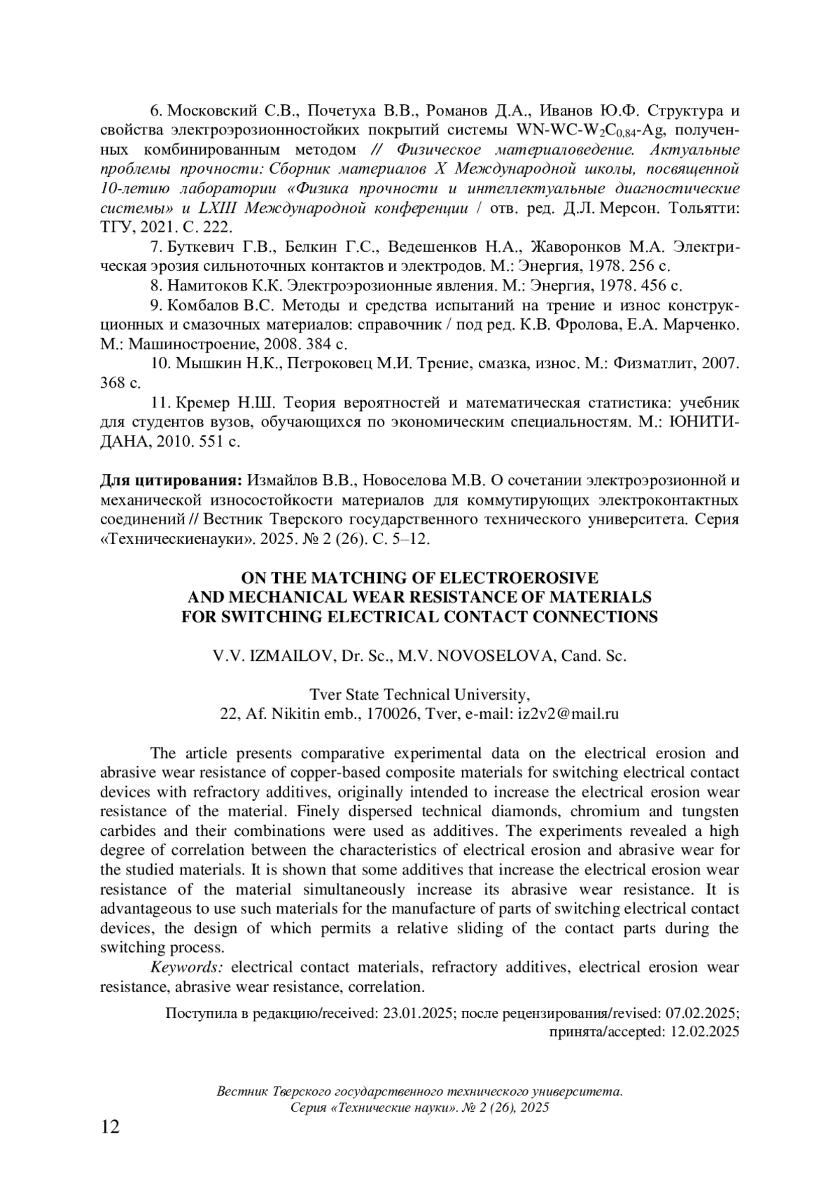 6. Московский С.В., Почетуха В.В., Романов Д.А., Иванов Ю.Ф. Структура и свойства электроэрозионностойких покрытий системы WN-WC-W2C0,84-Ag, полученных комбинированным методом // Физическое материаловедение. Актуальные проблемы прочности: Сборник материалов X Международной школы, посвященной 10-летию лаборатории “Физика прочности и интеллектуальные диагностические системы” и LXIII Международной конференции / отв. ред. Д.Л. Мерсон. Тольятти: ТГУ, 2021. С. 222. EDN: GFQEWT