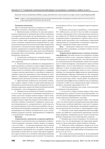 Цель — выявление социально-психологических особенностей осужденных, склонных к побегу из мест лишения свободы. Материалы и методы. Для исследования выбраны: методика «Акцент — 2-90»; методика психологической диагностики механизмов психологических защит; психодиагностическая система Келлермана-Плутчика для исследования механизмов психологических защит осужденных; методика исследования уровня субъективного контроля; анкета для выявления уголовно-правовых и социально-демографических особенностей личности; анкета для экспертов в целях выявления особенностей поведения осужденных в местах лишения свобод; методика выявления ценностных ориентаций личности. Результаты и обсуждение. Представлены результаты эмпирического исследования социально-психологических особенностей осужденных, состоящих на профилактическом учете как склонные к побегу. Проведен сравнительный анализ исследования данной категории осужденных с осужденными, состоявшими на профилактическом учете по другим причинам и не состоявшими на профилактическом учете. Выводы. Осужденные, склонные к побегу, имеют как общие черты с осужденными, состоящими на профилактическом учете, так и специфические, которые могут детерминировать данный вид пенитенциарного преступления.