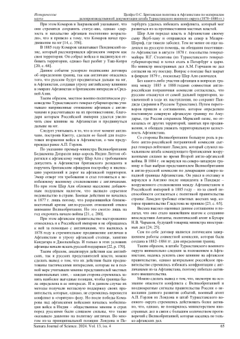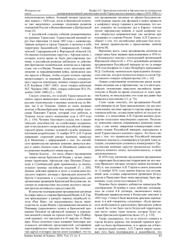 В работе рассматривается британская политика в Афганистане в 1870-1880 гг. по архивным материалам штаба Туркестанского военного округа. Анализируются донесения военного агента генерал-майора Александра Павловича Горлова касательно действий английского и индийского правительств в Афганистане, исследуются моменты, на которые обращалось особое внимание. Туркестанский военный округ в рассматриваемый период играл важную роль в политике Российской империи в Средней Азии. В указанных хронологических рамках англичане начинают продвижение к границам Афганистана и оказывают на него дипломатическое и военное давление, и от того, какую позицию занимал штаб Туркестанского военного округа, а также от того, какую именно информацию он получал от военных, политических агентов и разведки, зависели действия российского правительства. Отражены особенности формирования Туркестанского военного округа и его командования, характеризуется общая обстановка в Афганистане. Как важный факт отмечено, что данные события необходимо рассматривать в контексте противостояния Российской империи и Великобритании, получившего название «Большая игра». Исследование позволяет раскрыть отношение А. П. Горлова и настроения штаба военного округа, которые не вполне совпадали с настроениями, царившими в Санкт-Петербурге. В работе рассмотрены также особенности взаимодействия российских и английских представителей по вопросу определения афганских границ.