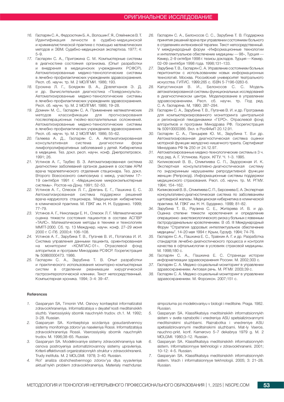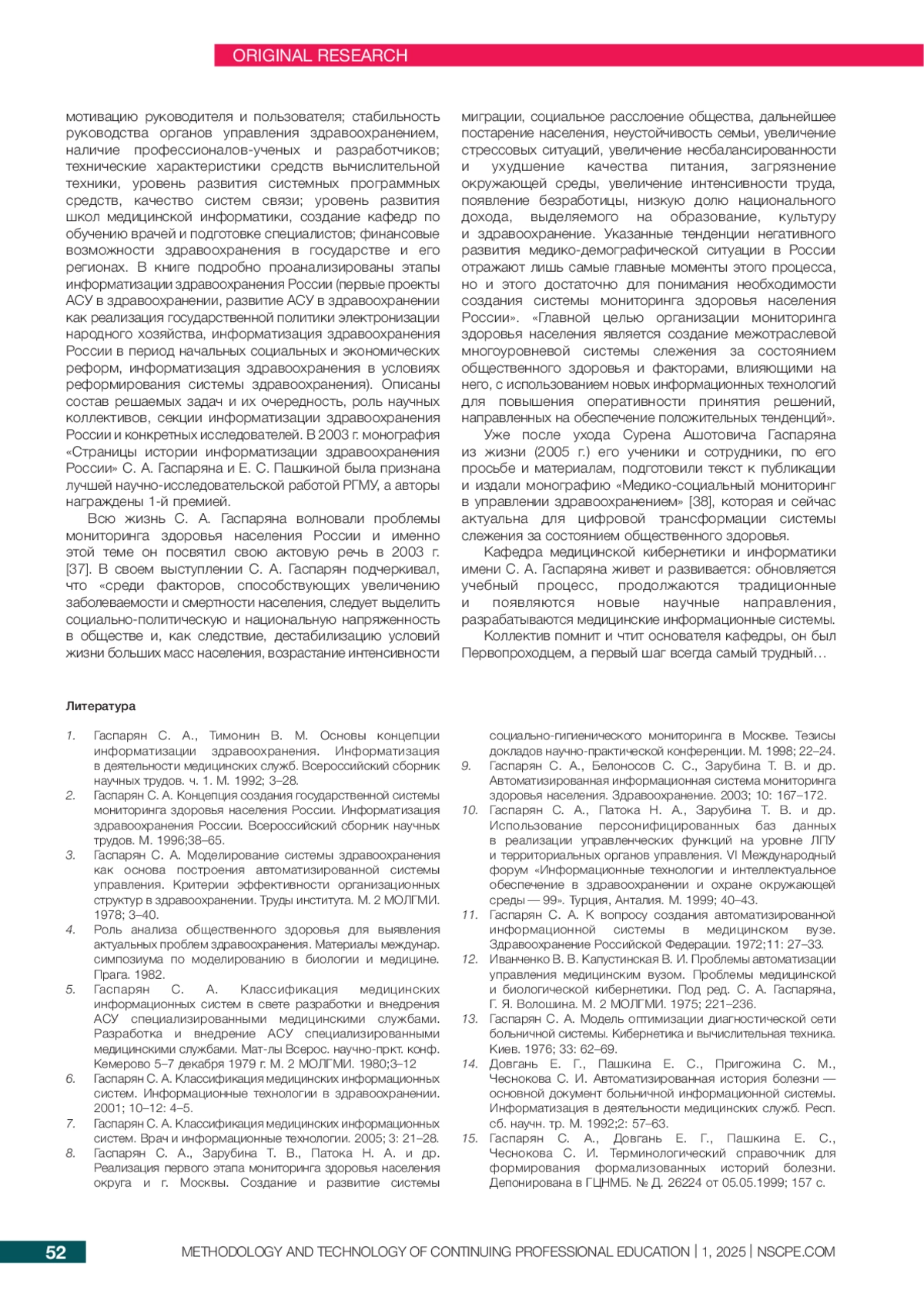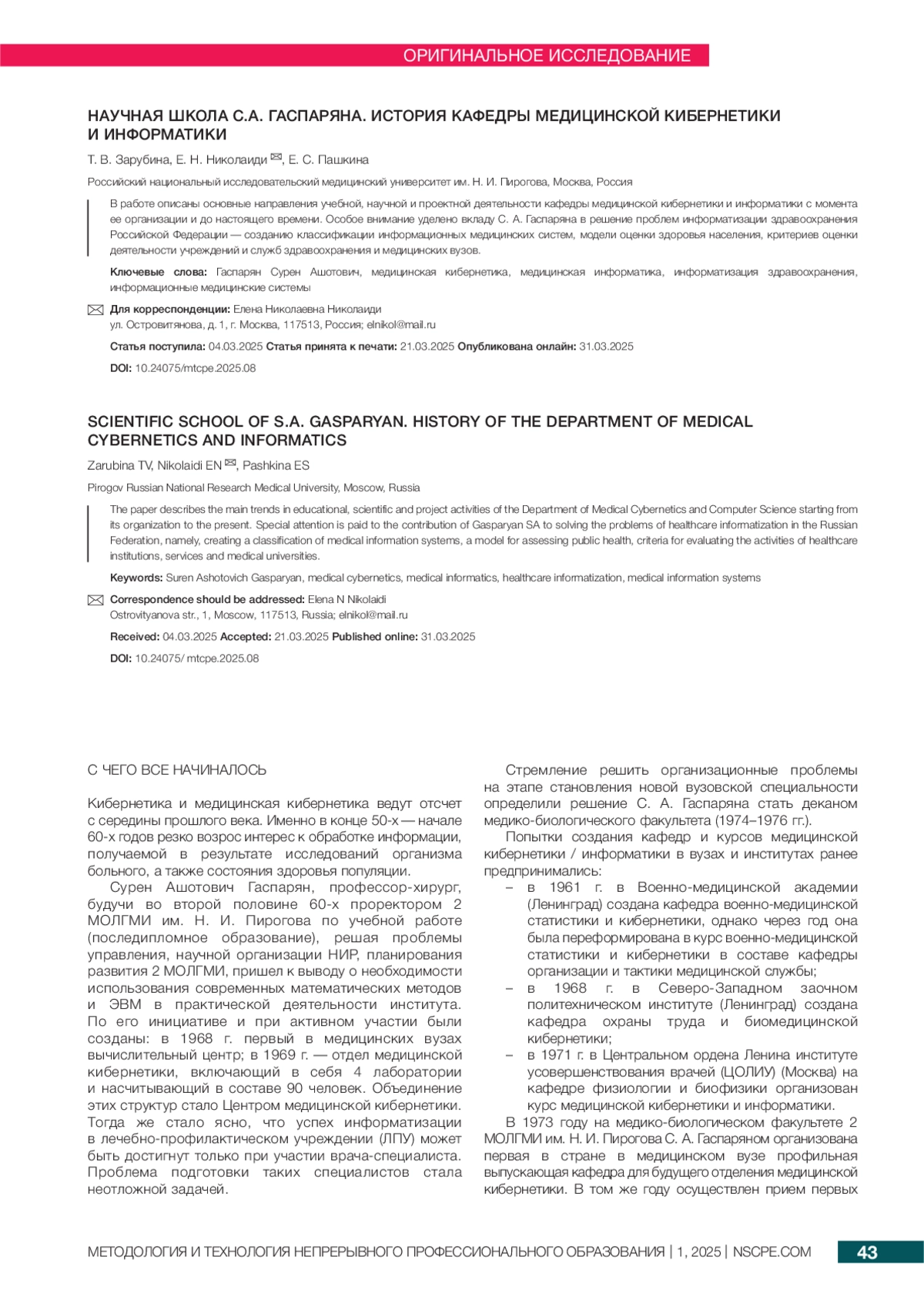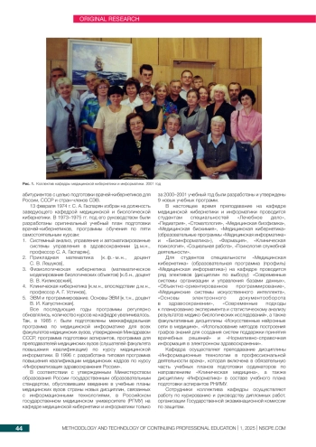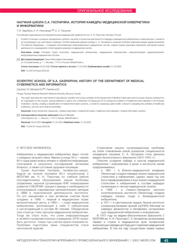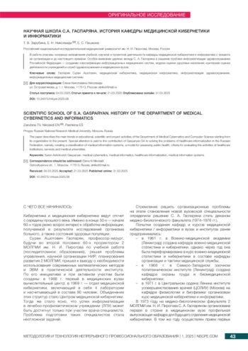 ЗАРУБИНА Т. В., НИКОЛАИДИ Е.Н., ПАШКИНА Е.С. НАУЧНАЯ ШКОЛА С. А. ГАСПАРЯНА. ИСТОРИЯ КАФЕДРЫ МЕДИЦИНСКОЙ КИБЕРНЕТИКИ И ИНФОРМАТИКИ // МЕТОДОЛОГИЯ И ТЕХНОЛОГИЯ НЕПРЕРЫВНОГО ПРОФЕССИОНАЛЬНОГО ОБРАЗОВАНИЯ. 2025. № 1 (21)
