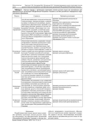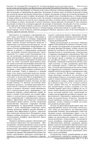 В статье обосновывается, что в условиях изменяющейся международной обстановки распространение русского языка является важным инструментом укрепления позиций России на мировой арене и формирования положительного имиджа страны. Аргументируется необходимость разработки этноориентированной модели подготовки учителя русского языка как иностранного для образовательных организаций Объединённой Республике Танзания в системе российского непрерывного педагогического образования, нацеленной (модель) на кадровое обеспечение процесса преподавания РКИ в Танзании с учетом специфики национальной системы образования страны, а также этнокультурных особенностей целевой аудитории. Доказывается, что разрабатываемая модель являет собой нормативную модель, отражающую представления о том, какими должны быть содержание, приемы, формы и средства организации образовательного процесса, обеспечивающие эффективную профессиональную подготовку учителей русского языка как иностранного для образовательных организаций Танзании из числа танзанийцев, обучающихся в России. Определяются приоритетные функции модели: объяснительная, иллюстративная, информационная и проективная функции. Обосновывается блочная структура модели и раскрывается содержание целевого, аналитико-диагностического, мотивационного, методологического, содержательного, методического и результативно-перспективного блоков. Раскрывается сущность этноориентированного, культурологического, аксиологического, коммуникативного и компетентностного подходов к организации подготовки учителя русского языка как иностранного для образовательных организаций Объединённой Республики Танзания в системе российского непрерывного педагогического образования и выявляются принципы реализации подходов: принцип национальной контекстности обучения, принцип учета национально-личностных характеристик обучающихся, принцип учета особенностей национальной системы образования обучающихся, принцип адаптационной направленности обучения РКИ иностранных студентов в системе российского образования, принцип международной интеграции, программно-целевой принцип, принцип учета родного языка и культуры обучающихся (этноориентированный подход); принцип диалога культур, принцип культуросообразности (культурологический подход); принцип ценностной ориентации, принцип субъектности (аксиологический подход); принцип функциональности, принцип новизны (коммуникативный подход); принцип дидактической последовательности, принцип личностной ориентированности (компетентностный подход).
