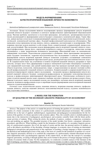 Целью исследования является моделирование процесса формирования качеств вторичной языковой личности будущего экономиста в контексте профессионально ориентированной образовательной среды. Научная проблема заключается в отсутствии прикладных, методических, организационно-педагогических рекомендаций по формированию качеств будущего специалиста экономической сферы. Таким образом, данная научная статья носит полидисциплинарный характер в силу пересечения педагогической, психологической, экономической научных сфер с будущей профессиональной деятельностью обучающихся. При написании статьи применены методы анализа, синтеза, сравнения, систематизации и моделирования. Обоснованная структура модели включает в себя четыре блока: концептуальный, содержательный, процессуальный, результативный. При построении модели формирования качеств вторичной языковой личности экономиста-профессионала, прежде всего, определены потребности социума и государства, личностные мотивы обучающихся, а также дидактические возможности дисциплины «Иностранный язык» на экономических направлениях подготовки. Педагогическая ретроспекция и обобщение опыта преподавания иностранного языка будущим экономистам, теоретико-методологическая база исследования в качестве основы модели формирования качеств вторичной языковой личности позволили установить составляющие компоненты профессионально ориентированной образовательной среды, реализуемой при психолингвистическом подходе. В содержательном блоке мы углубляемся в понятие вторичной языковой личности, раскрывая ее через качества, которые могут быть сформированы в процессе иноязычной подготовки обучающихся экономических направлений подготовки. Для данной манипуляции нами был проведен научный анализ литературы в области педагогики, психологии, лингводидактики, микро- и макроэкономики на предмет изучения особенностей профессиональной и языковой личности экономиста. Концептуальный и содержательный блоки в совокупности формулируют новизну нашего исследования - построение процесса формирования качеств вторичной языковой личности будущих экономистов-профессионалов на принципах психолингвистического подхода в профессионально ориентированной образовательной среде. Отличительные особенности подготовки студентов высшей школы также отражены в выборке методов и приемов для процессуального блока. Выводы и результат нашего исследования полезен для дальнейшего изучения качеств вторичной языковой личности экономиста-профессионала в вузе и апробации модели формирования качеств вторичной языковой личности студентов высшей школы.