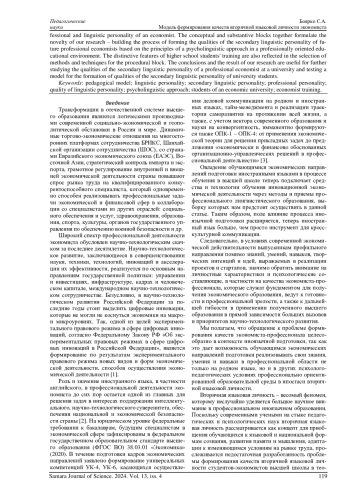 14. Боярко С.А. Психолингвистический подход к формированию качеств вторичной языковой личности будущих экономистов [Электронный ресурс] // Мир науки. Педагогика и психология. 2024. Т. 12, № 5. https://mir-nauki.com/70pdmn524.html. EDN: ERTRWB