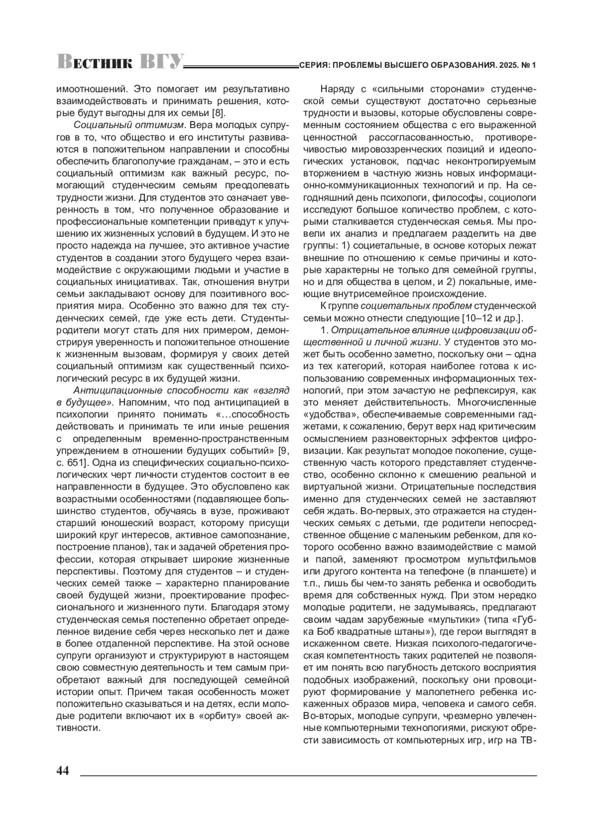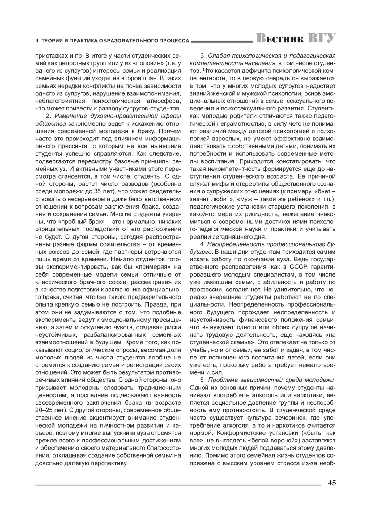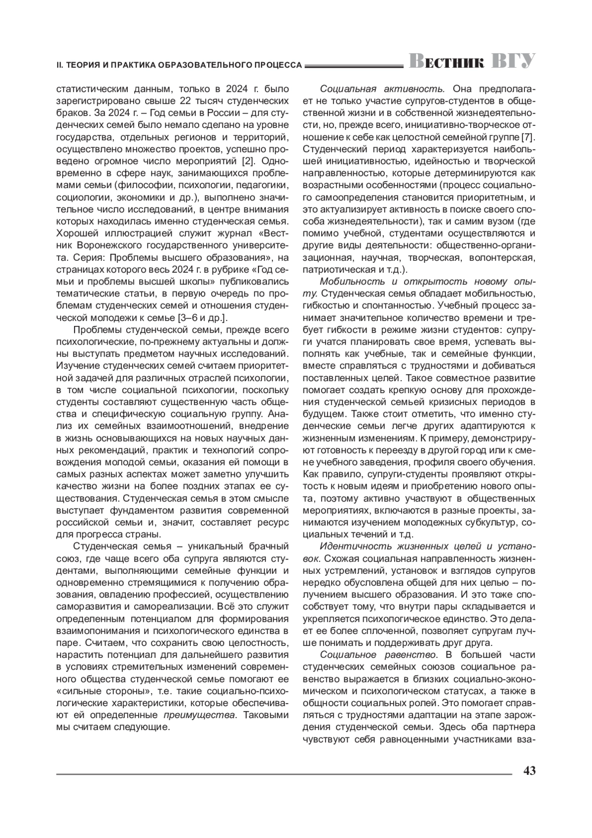 ПАШКОВА Я. А., ГАЙДАР К. М. РЕСУРСЫ И ПРОБЛЕМЫ СТУДЕНЧЕСКОЙ СЕМЬИ: СОЦИАЛЬНО-ПСИХОЛОГИЧЕСКИЙ АНАЛИЗ // ВЕСТНИК ВОРОНЕЖСКОГО ГОСУДАРСТВЕННОГО УНИВЕРСИТЕТА. СЕРИЯ: ПРОБЛЕМЫ ВЫСШЕГО ОБРАЗОВАНИЯ. 2025. № 1