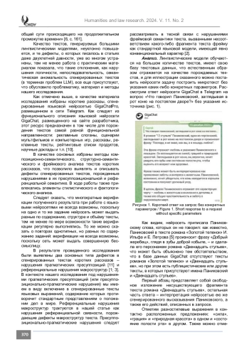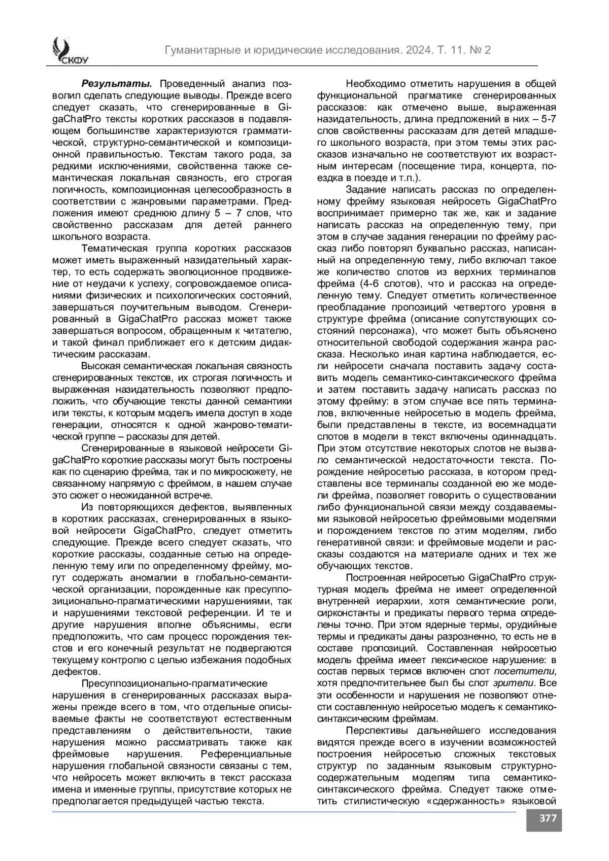 Результаты. Установлено, что при всей грамматической, структурно-семантической и композиционной адекватности, сгенерированные в GigaChatPro тексты коротких рассказов, созданные сетью на определенную тему или по определенному фрейму, могут содержать нарушения в глобально-семантической организации, порожденные как пресуппозициональнопрагматическими нарушениями, так и нарушениями текстовой референции. Отмечены также нарушения в общей функциональной прагматике сгенерированных рассказов: выраженная назидательность, длина предложений в них – 5-7 слов свойственны рассказам для детей младшего школьного возраста, при том, что темы этих рассказов изначально не соответствуют их возрастным интересам.