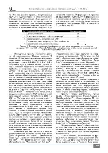 Анализ. Изучены закономерности и особенности развития проектов «Слово года» в медийном дискурсивном пространстве. Систематизированы исследуемые проекты по языкам и странам осуществления, периодам их реализации, выявлены площадки размещения информации о проектах, выделены осуществляющие их организации и поставленные организаторами цели.