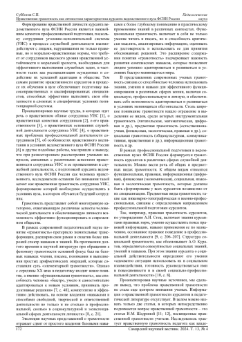В статье актуализируется проблема нравственного воспитания курсантов ведомственного вуза ФСИН России, одним из направлений которого становится формирование нравственной грамотности курсантов. Осуществляется анализ понятия «грамотность» и выявляются виды грамотности в целом и виды грамотности сотрудников УИС, формируемые в процессе профессиональной подготовки в ведомственных вузах ФСИН России. Раскрывается тенденция рассмотрения понятия «грамотность» в контексте различных аспектов нравственности при отсутствии в научном поле трудов, непосредственно посвященных нравственной грамотности курсантов. Обосновывается, что нравственная грамотность курсанта ведомственного вуза ФСИН России представляет собой устойчивую личностную характеристику курсанта, позволяющую ему осознанно реализовывать нравственные ценности в профессиональной деятельности, осуществляя ответственное, сострадательное и справедливое отношение к людям, вовлеченным в сферу деятельности исправительных учреждений, ориентироваться в сложных моральных ситуациях и принимать обоснованные решения, соответствующие общепринятым нормам морали и этическим стандартам службы. Раскрывается содержание нравственной грамотности курсантов ведомственного вуза ФСИН России через выделение когнитивного, мотивационно-ценностного и поведенческого компонентов, наполнение которых базируется на требованиях к личности сотрудника УИС. Предлагается содержание когнитивного компонента, образуемого знаниями о нравственности, о морали, о профессиональной этике, о моральных нормах, о нравственных убеждениях, о нравственной устойчивости. Обосновывается состав мотивационно-ценностного компонента: ценности «добро», «верность», «долг», «достоинство», «милосердие», «ответственность», «совесть», «свобода», «справедливость», «уважение», «честь». Обозначается содержание поведенческого компонента: нравственные качества «доброта», «обязательность», «благородство», «сострадание», «терпимость», «честность», «требовательность», «самостоятельность», «совестливость», «великодушие», «надежность».