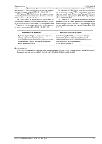 20. Назарова М.Г. Проблема нравственного воспитания личности сотрудника УИС в современной культурно-образовательной среде [Электронный ресурс] // Гуманитарные научные исследования. 2019. № 6. https://human.snauka.ru/2019/06/25947. EDN: UYLLBL