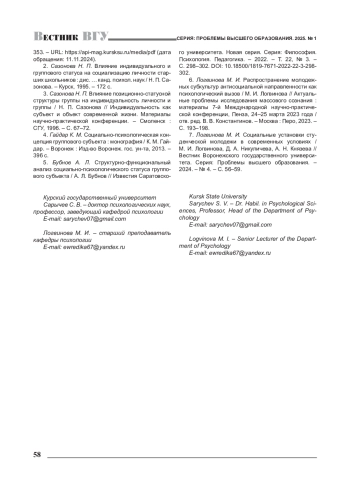 7. Логвинова М. И. Социальные установки студенческой молодежи в современных условиях / М. И. Логвинова, Д. А. Никуличева, А. Н. Князева II Вестник Воронежского государственного университета. Серия: Проблемы высшего образования. -2024. - № 4. - С. 56-59.