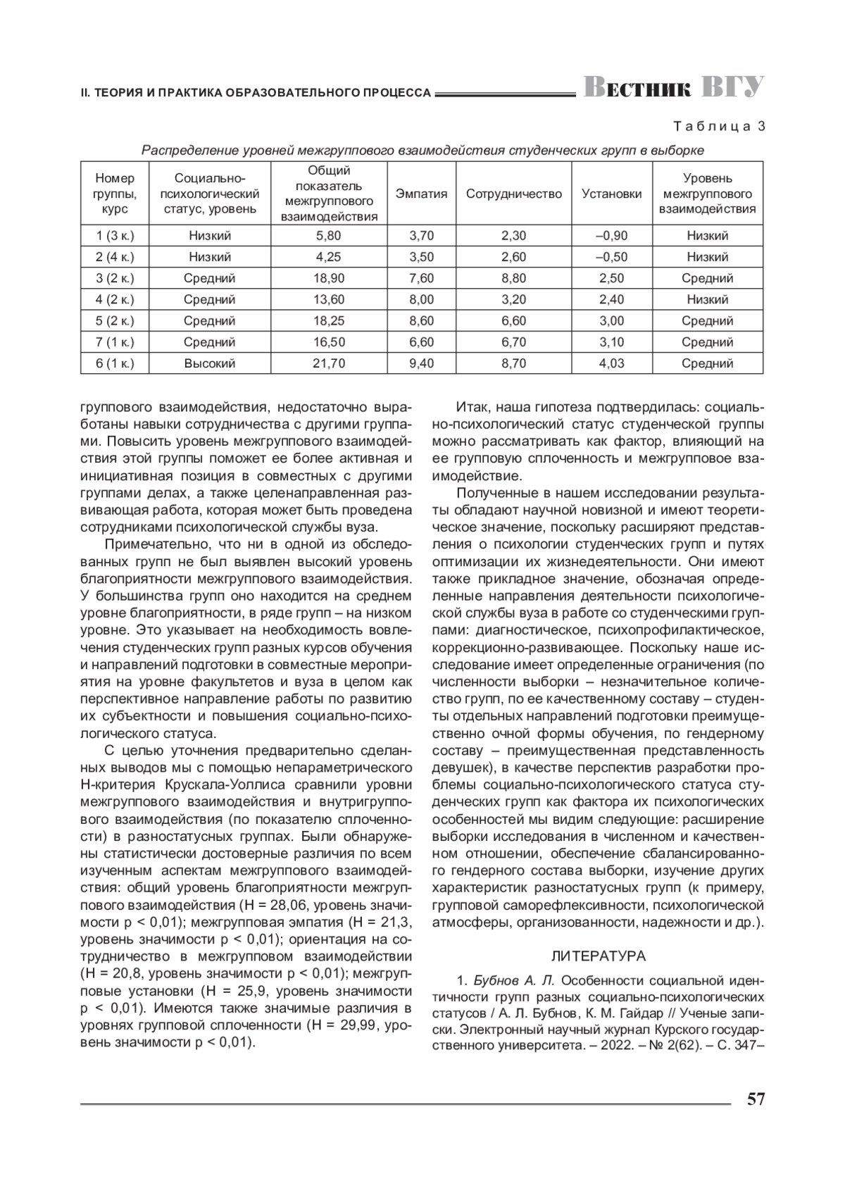 1. Бубнов А. Л. Особенности социальной идентичности групп разных социально-психологических статусов / А. Л. Бубнов, К. М. Гайдар // Ученые записки. Электронный научный журнал Курского государственного университета. - 2022. - № 2(62). - С. 347-353. - URL: https://api-mag.kursksu.ru/media/pdf (дата обращения: 11.11.2024). EDN: DDHFOT