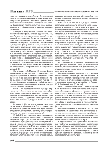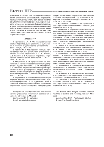 ЗЕМЛЯНУХИНА О.С. ИССЛЕДОВАТЕЛЬСКАЯ КУЛЬТУРА БУДУЩЕГО ПЕДАГОГА: ИСТОРИКОПЕДАГОГИЧЕСКИЙ АСПЕКТ // ВЕСТНИК ВОРОНЕЖСКОГО ГОСУДАРСТВЕННОГО УНИВЕРСИТЕТА. СЕРИЯ: ПРОБЛЕМЫ ВЫСШЕГО ОБРАЗОВАНИЯ. 2025. № 1