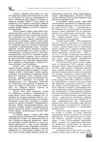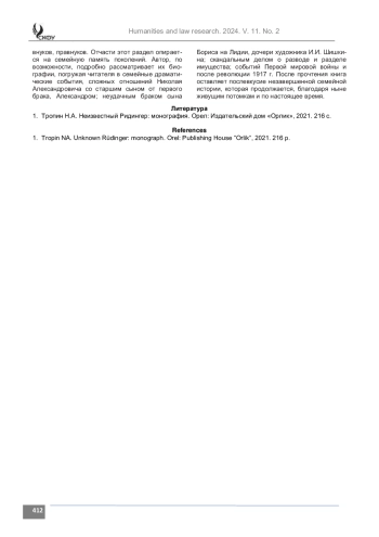 Для цитирования: Степанова Ю. В. Этюды эпохи через призму истории рода [Рецензия на книгу: Тропин Н. А. Неизвестный Ридингер: монография. Орел: Издательский Дом «Орлик», 2021. 216 с. ISBN 978-5-903259-84-7: 500 экз.]. Гуманитарные и юридические исследования. 2024;11(2):410-412. https://doi. org/10.37493/2409-1030.2024.2.26