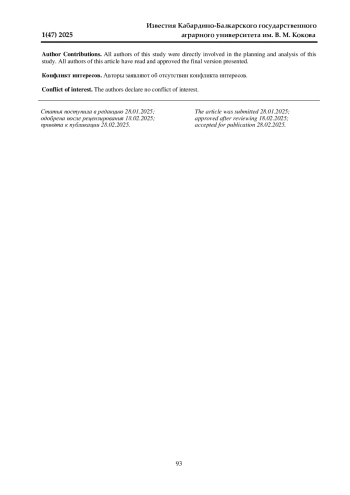 Выявление потенциала продуктивности голштинского скота и характера реализации в зависимости от паратипических факторов и линейной принадлежности актуально и представляет научный и практический интерес. Сравнительное изучение потенциала продуктивности интродуцированных голштинских нетелей, которое проводилось в ООО «Агро-Союз» Чегемского района Кабардино-Балкарской Республики, показало, что между группами подопытных животных установлены различия, обусловленные линейной принадлежностью. Среди матерей нетелей более высокие значения удоя за 305 дней лактации установлены у животных линии В. Б. Айдиала 1013415, которые превосходили сверстниц линии Р. Соверинга 198998 на 5,7% (P<0,95). Более высокая жирномолочность установлена у коров матерей линии Р. Соверинга 198998 по сравнению с матерями нетелей линии В. Б. Айдиала 1013415, которая составила 0,14 абс.% (P<0,95). Подобные результаты получены и при изучении белковомолочности, т. е. превосходство коров линии Р. Соверинга 198998 над животными линии В. Б. Айдиала 1013415 по содержанию белка в молоке составляет 0,04 абс. % (P <0,95). В целом интродуцированные нетели голштинской породы характеризуются высоким генетическим потенциалом продуктивности, которая колебалась по удою в пределах 10621-11073 кг, по жирномолочности - 3,88-3,94%, по белковомолочности - 3,19-3,2%. Материнские предки завезенных нетелей разных линий характеризовались сходными показателями удоя, жирномолочности, хотя по белковомолочности в группах матерей матерей и матерей отцов выявлены достоверные различия.