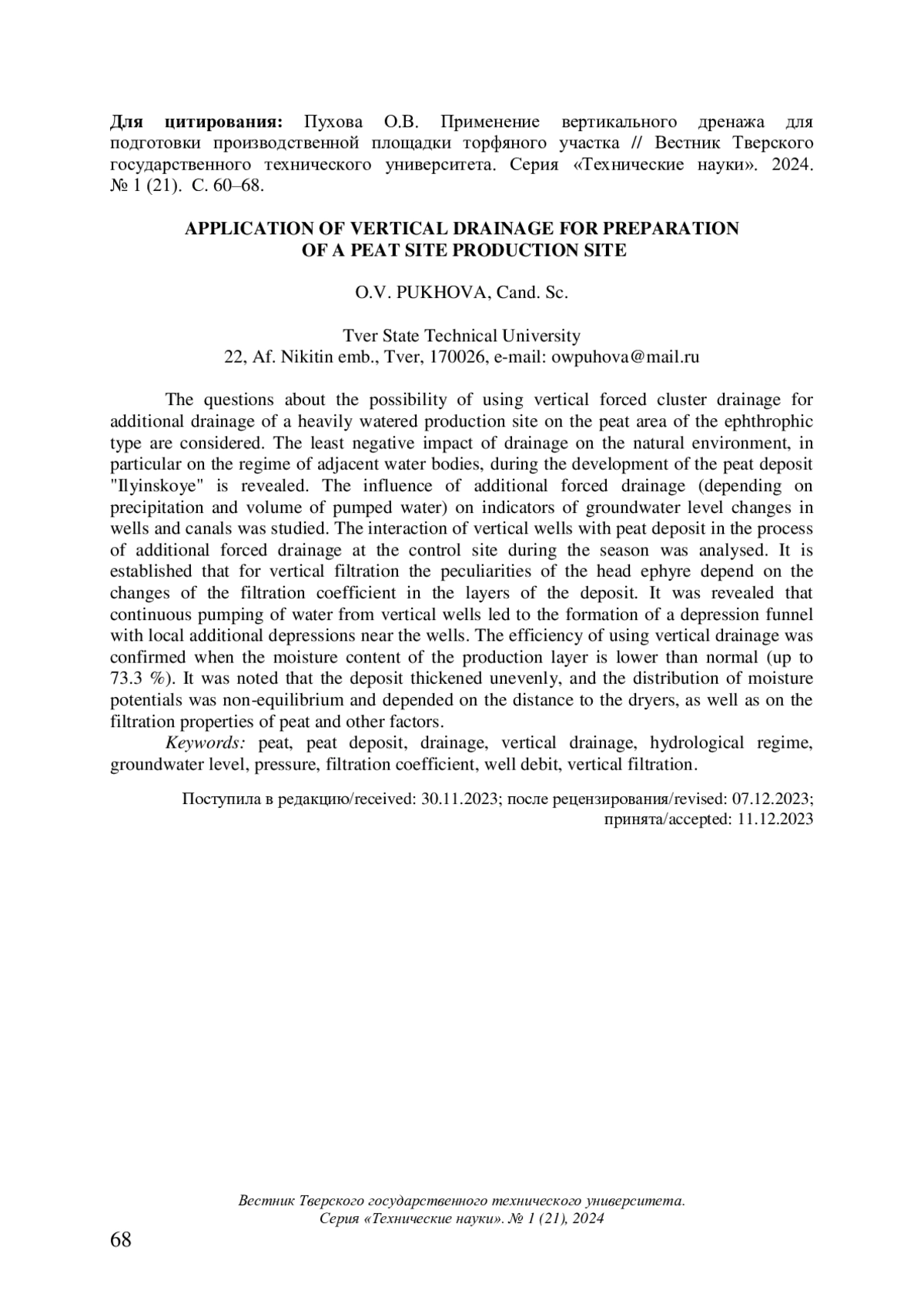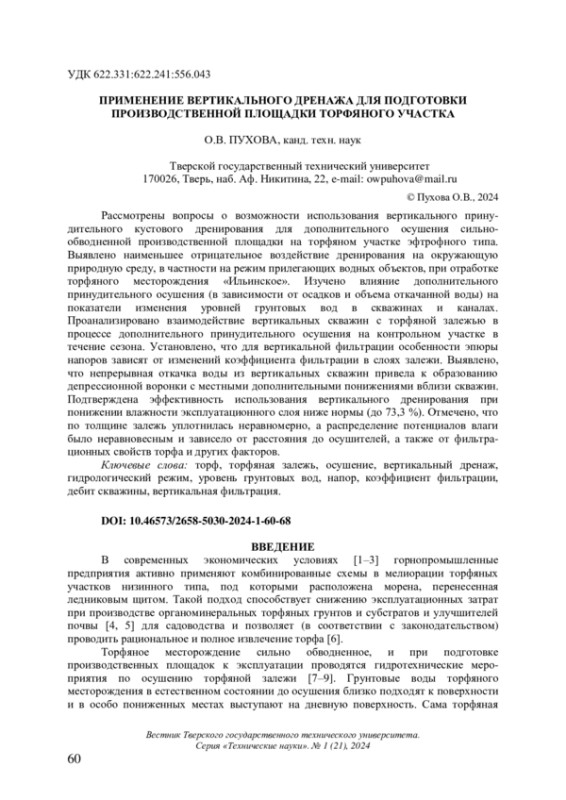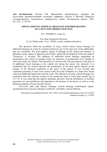 Статья: ПРИМЕНЕНИЕ ВЕРТИКАЛЬНОГО ДРЕНАЖА ДЛЯ ПОДГОТОВКИ ПРОИЗВОДСТВЕННОЙ ПЛОЩАДКИ ТОРФЯНОГО УЧАСТКА (2024)