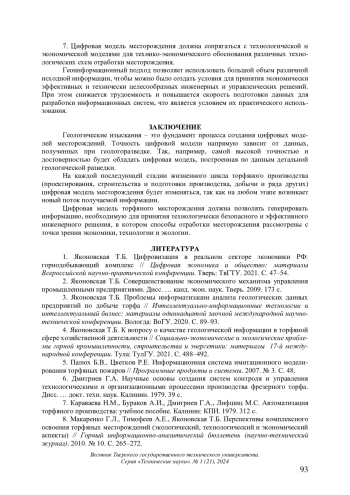 4. Яконовская Т.Б. К вопросу о качестве геологической информации в торфяной сфере хозяйственной деятельности // Социально-экономические и экологические проблемы горной промышленности, строительства и энергетики: материалы 17-й международной конференции. Тула: ТулГУ. 2021. С. 488-492. EDN: GWZUZB