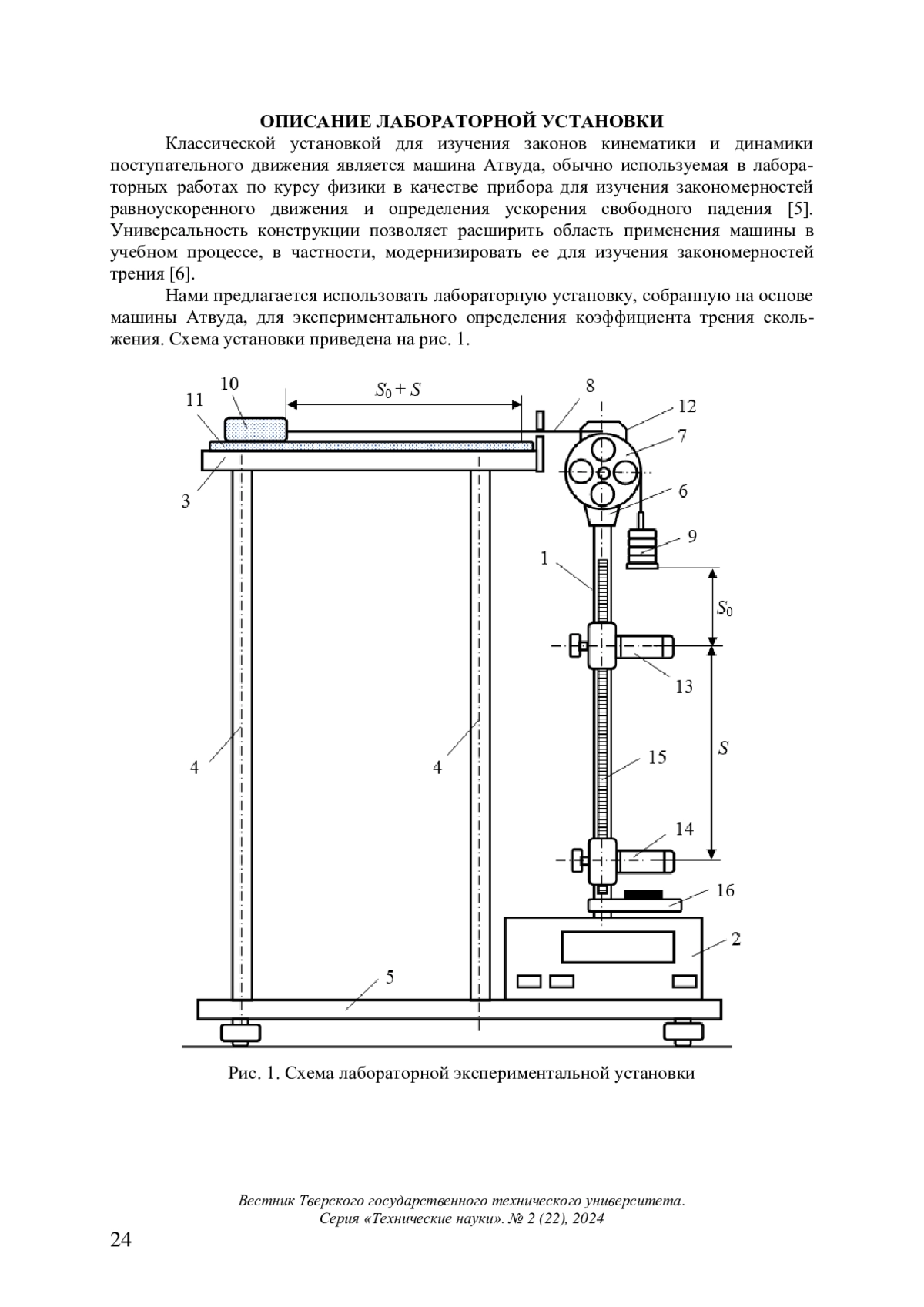 Представлена схема и дано описание конструкции лабораторной установки для экспериментального определения коэффициента трения скольжения, собранной на основе классической машины Атвуда. Описана методика проведения измерений. Предложены формулы, позволяющие рассчитать коэффициент трения. Преимуществом представленной установки является предельно простая и самая надежная схема нагружения контакта трущихся поверхностей – гравитационная, которая обеспечивает стабильные и абсолютно точные значения как силы нормального давления на контакт, так и тангенциальной силы. Относительная приборная погрешность не превышает 0,5 %, что значительно меньше случайной погрешности, характерной для экспериментов по измерению коэффициентов трения. Рекомендуется использовать модернизированную установку и методику для создания лабораторной работы в курсах трибологии и триботехники