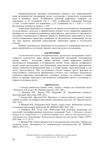 5. Измайлов В.В., Гусев А.Ф., Новоселова М.В. Комплекс аппаратуры для испытаний электрофрикционных контактных соединений. Часть 1. Механика и физика процессов на поверхности и в контакте твердых тел, деталей технологического и энергетического оборудования: Межвузовский сборник научных трудов. Тверь: ТвГТУ, 2022. Вып. 15. С. 29-37. EDN: JWMQVH