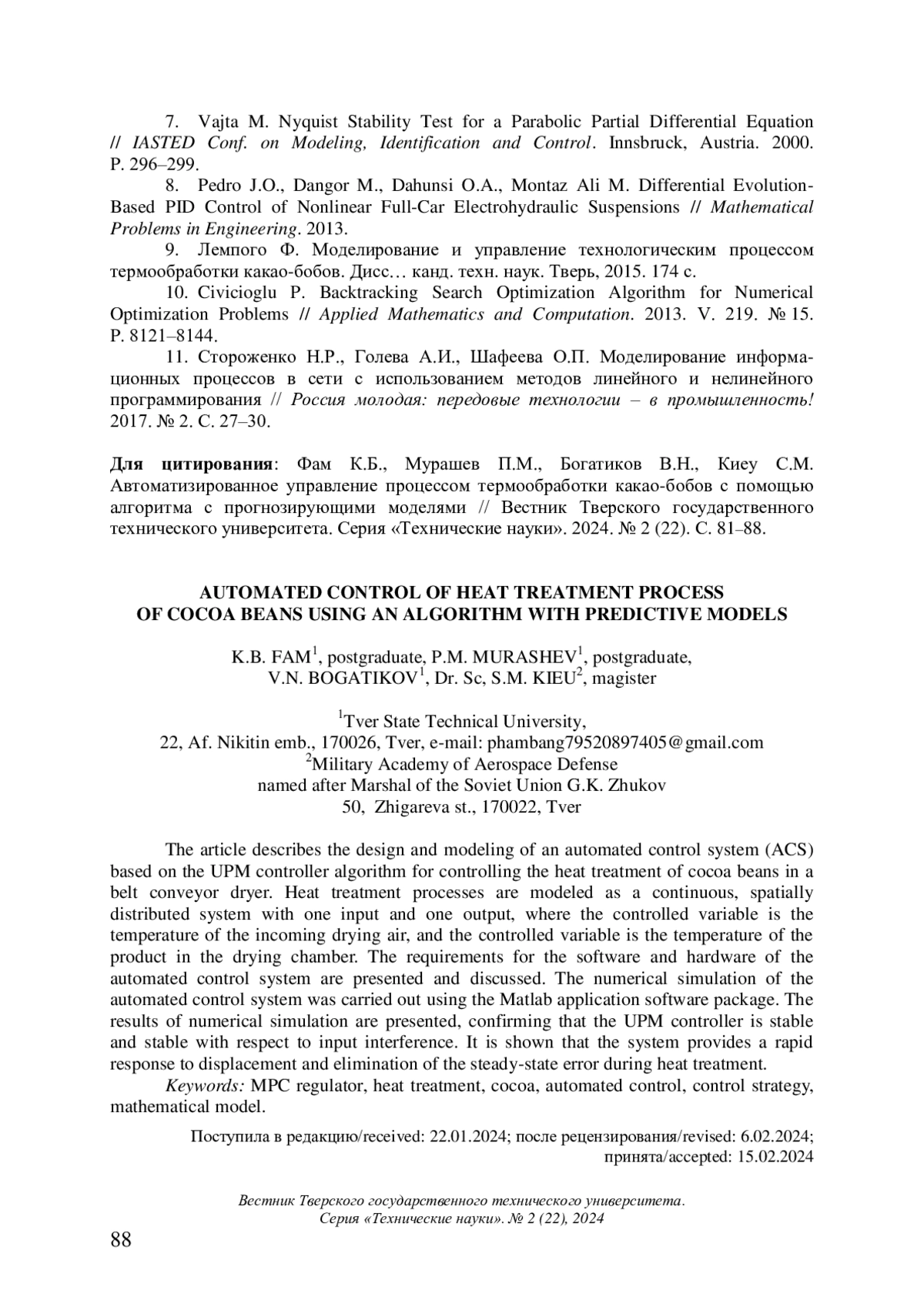 ФАМ К. Б., МУРАШЕВ П. М., БОГАТИКОВ В. Н., КИЕУ С. М. АВТОМАТИЗИРОВАННОЕ УПРАВЛЕНИЕ ПРОЦЕССОМ ТЕРМООБРАБОТКИ КАКАО-БОБОВ С ПОМОЩЬЮ АЛГОРИТМА С ПРОГНОЗИРУЮЩИМИ МОДЕЛЯМИ // ВЕСТНИК ТВЕРСКОГО ГОСУДАРСТВЕННОГО ТЕХНИЧЕСКОГО УНИВЕРСИТЕТА. СЕРИЯ: ТЕХНИЧЕСКИЕ НАУКИ. 2024. № 2 (22)