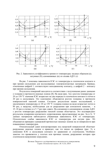 В работе описаны результаты экспериментального исследования фрикционных и электроконтактных характеристик четырех наиболее распространенных материалов для электрических контактов. Исследования проводили на машине трения типа ГП (горизонтальная плоскость) по схеме торцевого трения одноименных материалов с коэффициентом взаимного перекрытия, стремящимся к нулю, при температурах от 20 до 150 оС. Представлены экспериментальные зависимости коэффициента трения f и контактного электрического сопротивления R в статике и при трении скольжения от температуры. Эксперименты показали, что при повышенных температурах определяющее влияние на эксплуатационные характеристики исследованных электроконтактных материалов оказывают поверхностные окисные пленки. Установлено, что результаты экспериментов находятся в хорошем соответствии с полученными ранее данными о параметрах удельной силы трения, толщине и прочности окисных пленок для изученных материалов