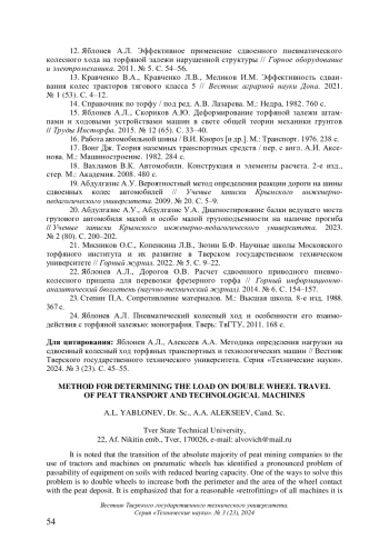 24. Яблонев А.Л. Пневматический колесный ход и особенности его взаимодействия с торфяной залежью: монография. Тверь: ТвГТУ, 2011. 168 с. EDN: QMZBTV