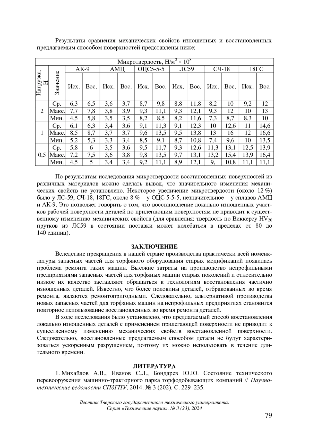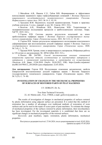 6. Горлов И.В. Анализ результатов эмпирического исследования пластического деформирования при восстановлении деталей торфяных машин // Вестник Тверского государственного технического университета. Серия “Технические науки”. 2020. № 2 (6). С. 71-78. EDN: ZKRMVT