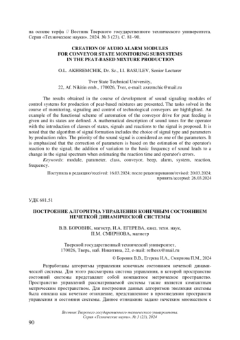 Представлены результаты, полученные в ходе разработки модулей звуковой сигнализации систем управления производством смесей на основе торфа. Выделены задачи, решаемые в ходе контроля, сигнализации и управления технологическими конвейерами. Приведен пример функциональной схемы автоматизации привода конвейера для подачи торфа, определены его состояния. Предложено математическое описание звуковых тональных сигналов для оператора с введением классов состояний, сигналов и реакций на сигнал. Отмечено, что алгоритм формирования сигнала включает выбор вида и параметров сигнала по продукционным правилам. Приоритет звукового сигнала рассмотрен как один из параметров. Подчеркнуто, что коррекция параметров происходит на основе оценки реакции оператора на сигнал; добавление к основной частоте звука вариации приводит к изменению спектра сигнала при оценке времени реакции и ошибок оператора