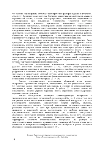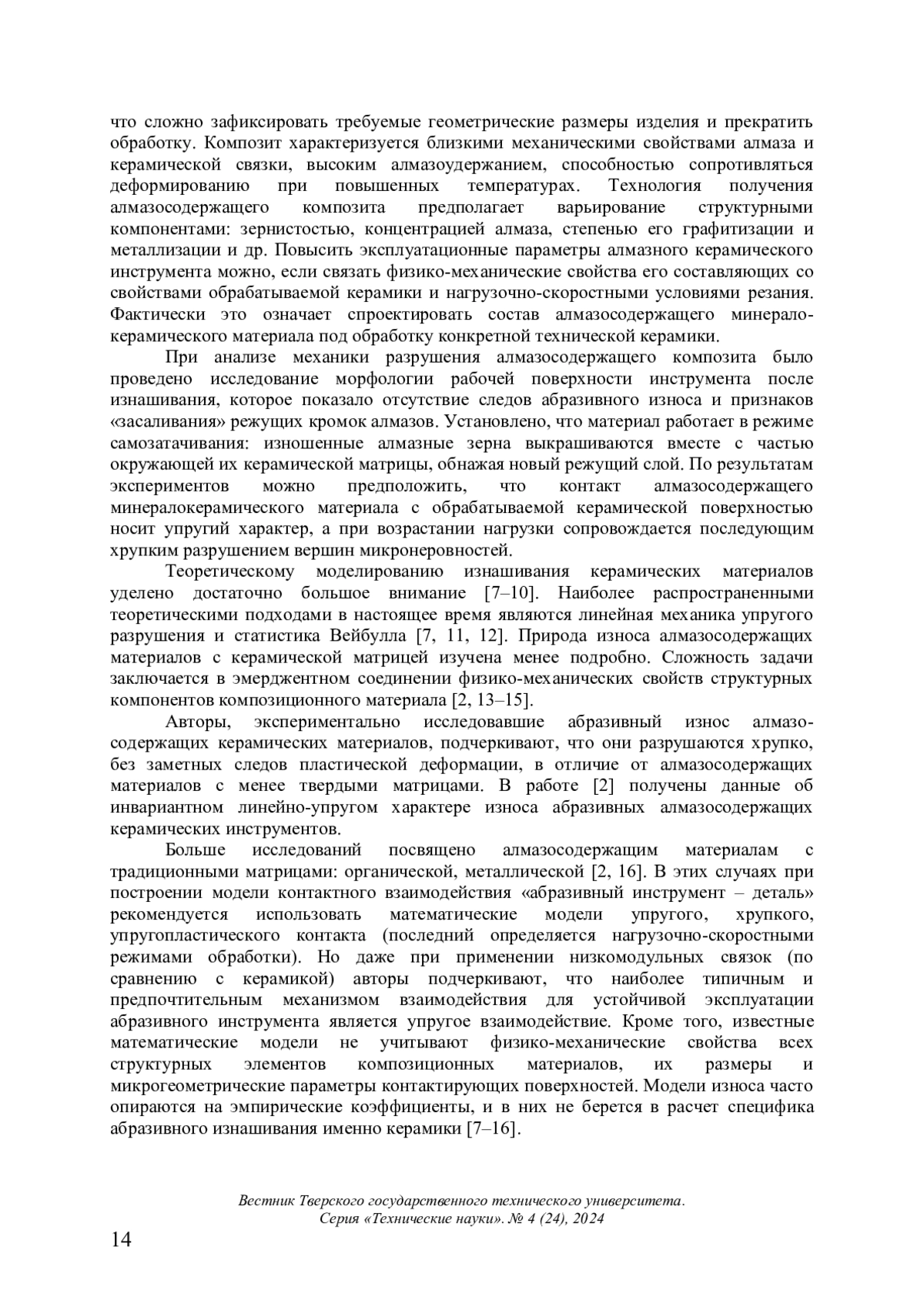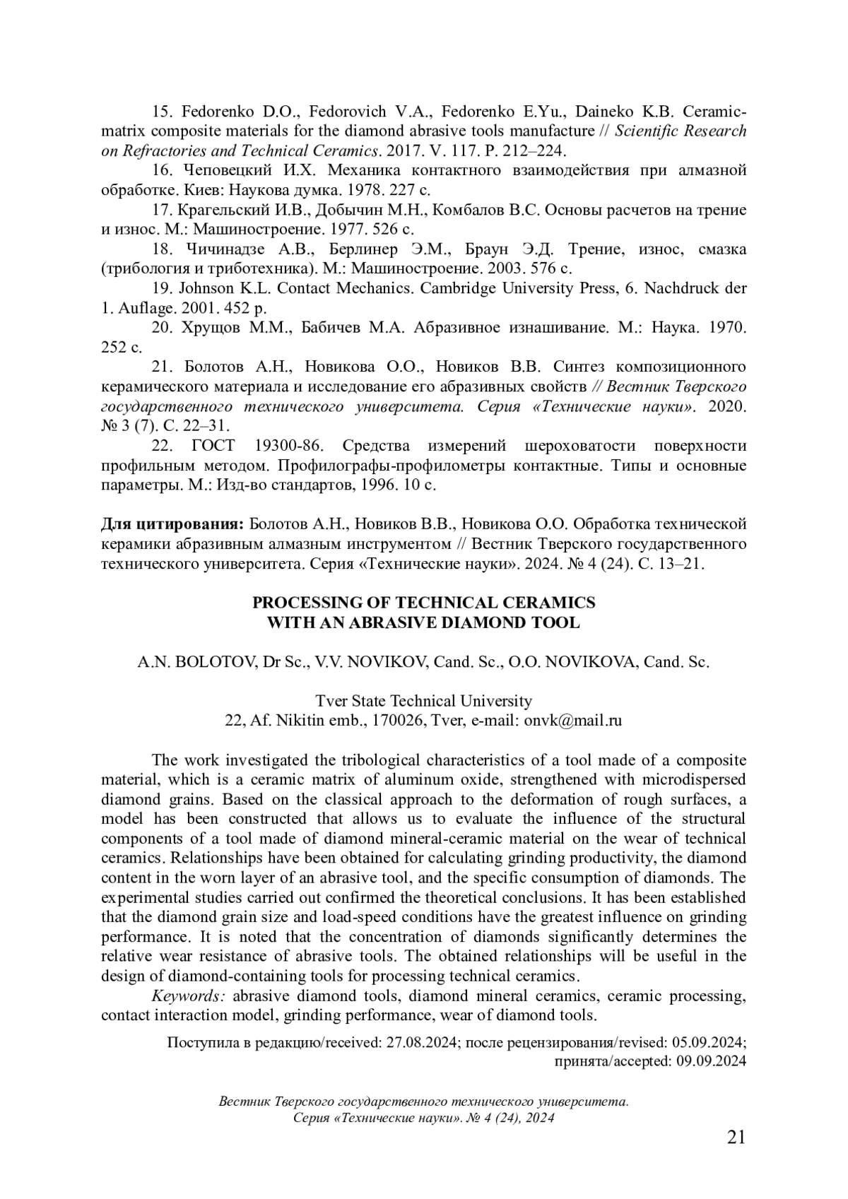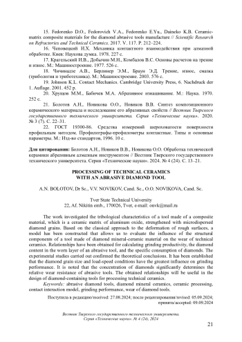 БОЛОТОВ А. Н., НОВИКОВ В. В., НОВИКОВА О. О. ОБРАБОТКА ТЕХНИЧЕСКОЙ КЕРАМИКИ АБРАЗИВНЫМ АЛМАЗНЫМ ИНСТРУМЕНТОМ // ВЕСТНИК ТВЕРСКОГО ГОСУДАРСТВЕННОГО ТЕХНИЧЕСКОГО УНИВЕРСИТЕТА. СЕРИЯ: ТЕХНИЧЕСКИЕ НАУКИ. 2024. № 4 (24)