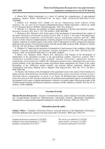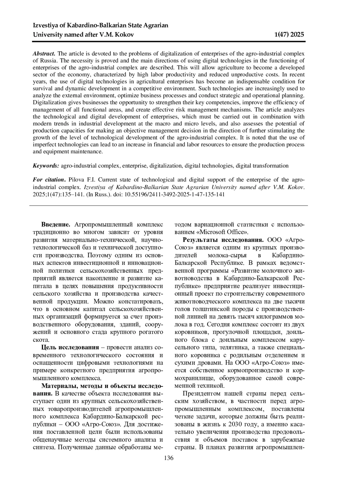 ПИЛОВА Ф. И. СОВРЕМЕННОЕ СОСТОЯНИЕ ТЕХНОЛОГИЧЕСКОЙ И ЦИФРОВОЙ ОБЕСПЕЧЕННОСТИ ПРЕДПРИЯТИЯ АГРОПРОМЫШЛЕННОГО КОМПЛЕКСА // ИЗВЕСТИЯ КАБАРДИНО-БАЛКАРСКОГО ГОСУДАРСТВЕННОГО АГРАРНОГО УНИВЕРСИТЕТА ИМ. В. М. КОКОВА. 2025. № 1 (47)