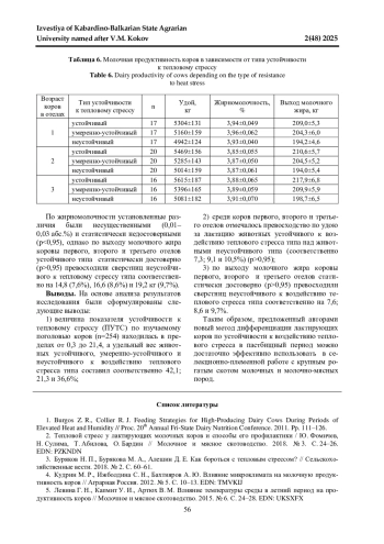 Уровень молочной продуктивности крупного рогатого скота, помимо генетических факторов, обусловливается влиянием паратипических факторов, к которым относятся температурно-влажностные показатели окружающей среды. Высокая температура и влажность воздуха в летний период, когда животные находятся на пастбищах, и микроклимат невозможно искусственно регулировать, могут вызвать у лактирующих коров тепловой стресс, приводящий к снижению величины суточного удоя. Цель исследования заключалась в апробации предложенной авторами новой методики дифференциации лактирующих коров молочных и молочно-мясных пород по устойчивости к воздействию теплового стресса на основе величины ПУТС (показатель устойчивости к тепловому стрессу). Исследования проводили в ООО «Дарган» Черекского района Кабардино-Балкарской Республики в 2024-2025 гг. на 254 коровах бурой швицкой породы. Авторами разработана специальная шкала дифференциации лактирующих коров, согласно которой устойчивыми к тепловому стрессу являются животные с величиной ПУТС 4,9 и менее, умеренно-устойчивыми - от 5,0 до 9,9; неустойчивыми 10,0 и более. Среди исследованных авторами 254 коров удельный вес животных устойчивого, умеренно-устойчивого и неустойчивого к тепловому стрессу типа был равен соответственно 42,1; 21,3 и 36,6%. Сравнительный анализ продуктивности показал, что животные устойчивого типа превосходили сверстниц неустойчивого к тепловому стрессу типа по удою за лактацию на 7,3% (коровы первого отела), 9,1% (коровы второго отела) и 10,5% (коровы третьего отела). По выходу молочного жира превосходство коров устойчивого типа над животными неустойчивого к тепловому стрессу типа составило 7,6% (коровы первого отела), 8,6% (коровы второго отела) и 9,7% (коровы третьего отела). Во всех случаях сравнения установленные различия оказались статистически достоверными (p>0,95).