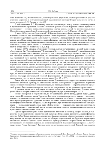 РЕБЕЛЬ Г. М. «И В ЭТОМ ХАОСЕ ДОЛЖЕН ПОГИБАТЬ ТАКОЙ ОДАРЕННЫЙ ЧЕЛОВЕК!!» И. С. ТУРГЕНЕВ О РОМАНЕ Л. Н. ТОЛСТОГО «АННА КАРЕНИНА» // ВЕСТНИК УДМУРТСКОГО УНИВЕРСИТЕТА. СЕРИЯ: ИСТОРИЯ И ФИЛОЛОГИЯ. 2025. Т. 35 № 2